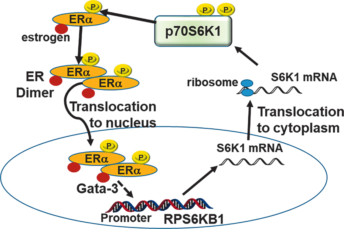 Figure 4. Positive co-regulatory mechanism of S6K1 and ERα. Estrogen binding and phosphorylation by S6K1 activates ERα leading to its dissociation of heat shock proteins (HSPs) and dimerization. ERα dimer translocates to the nucleus where it activates the promoter region of RPS6KB1 and upregulates the transcription of S6K1 mRNA resulting in a positive feed-forward loop.