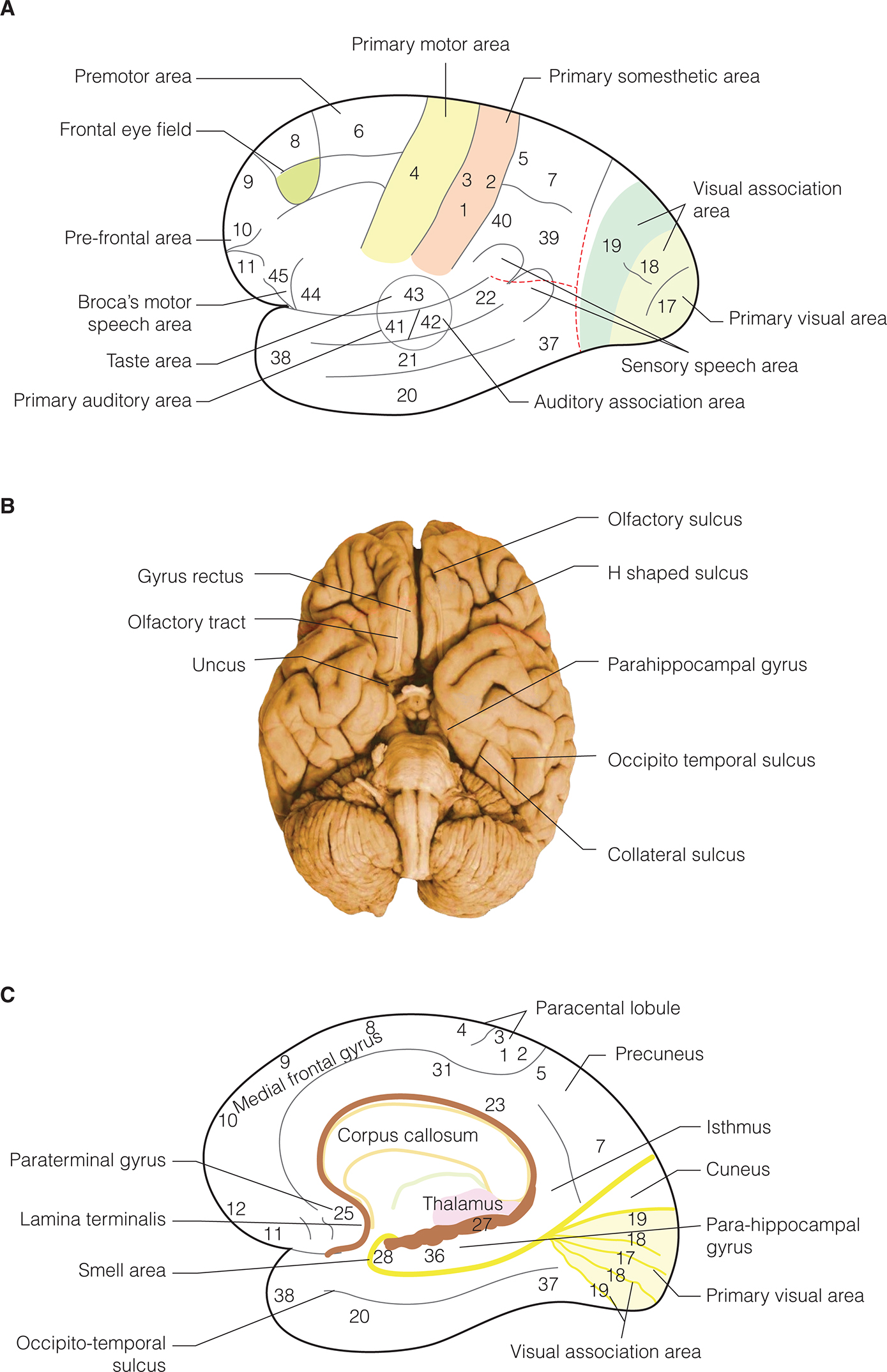 Figure 2. Sulci, gyri, and functional areas. A, Superolateral surface. B, Inferior surface. C, Medial surface.