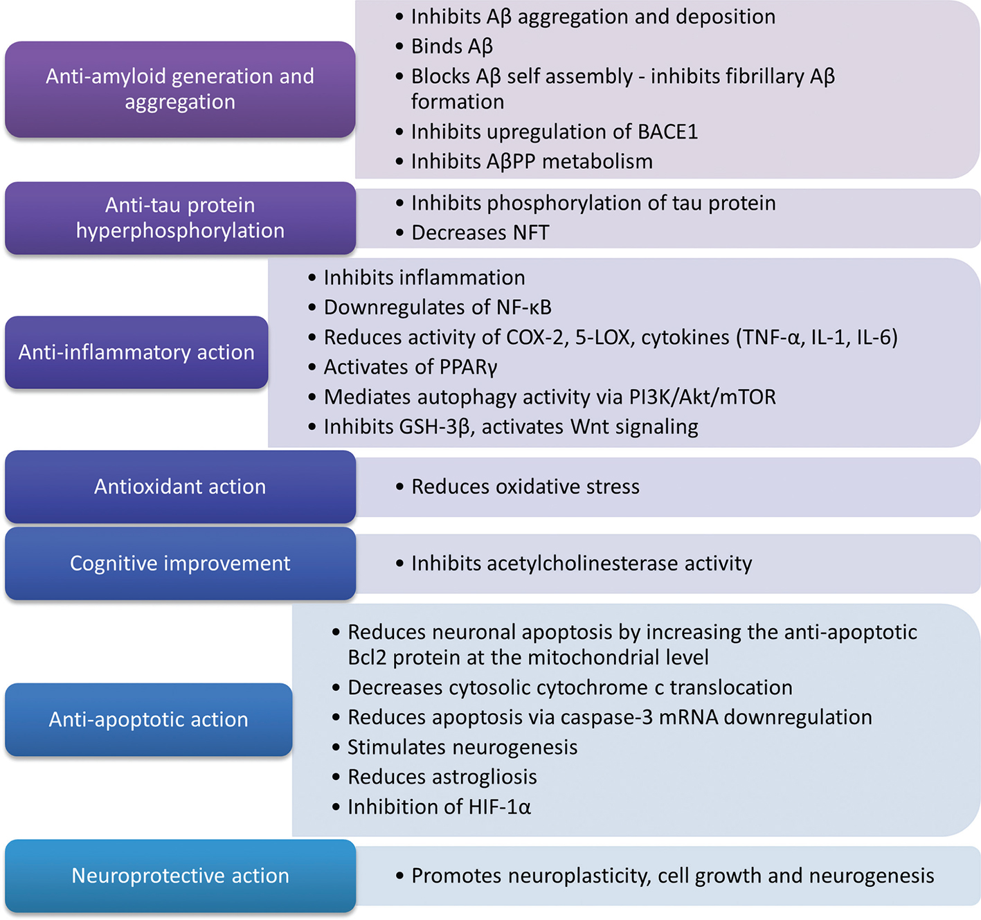 Hyperphosphorylated tau protein as paired helical filaments is a component of NFT in brain ischemia (81). They change the cytoarchitecture of brain tissue, increase oxidative stress, cause mitochondrial dysfunction, and promote neurodegeneration (82). Therefore, the phosphorylation of tau protein may be a link between oxidative stress and cognitive decline. The tau protein hyperphosphorylation is modulated by several kinases, including glycogen synthase kinase-3β (GSK-3β) and mitogen-activated protein kinase (MAPK) (82), cyclin-dependent kinase 5, S6 kinase, protein kinase A, calcium/calmodulin-dependent protein kinase II, SAD kinase, extracellular signal-regulated kinase 2, microtubule affinity-regulating kinase, and Src family kinases (Fyn and c-Abl). Therefore, a combined therapy involving these checkpoints could become a viable therapeutic option for ischemia-related brain damage and/or AD treatment (83). Curcumin has been found to inhibit tau protein aggregation, and disintegrate preformed tau protein oligomers and the formation of tau protein fibril (84). Moreover, it inhibits GSK-3β activity, diminishing tau protein dimer formation and hyperphosphorylated tau protein oligomerization in aged human tau protein transgenic mice (66).