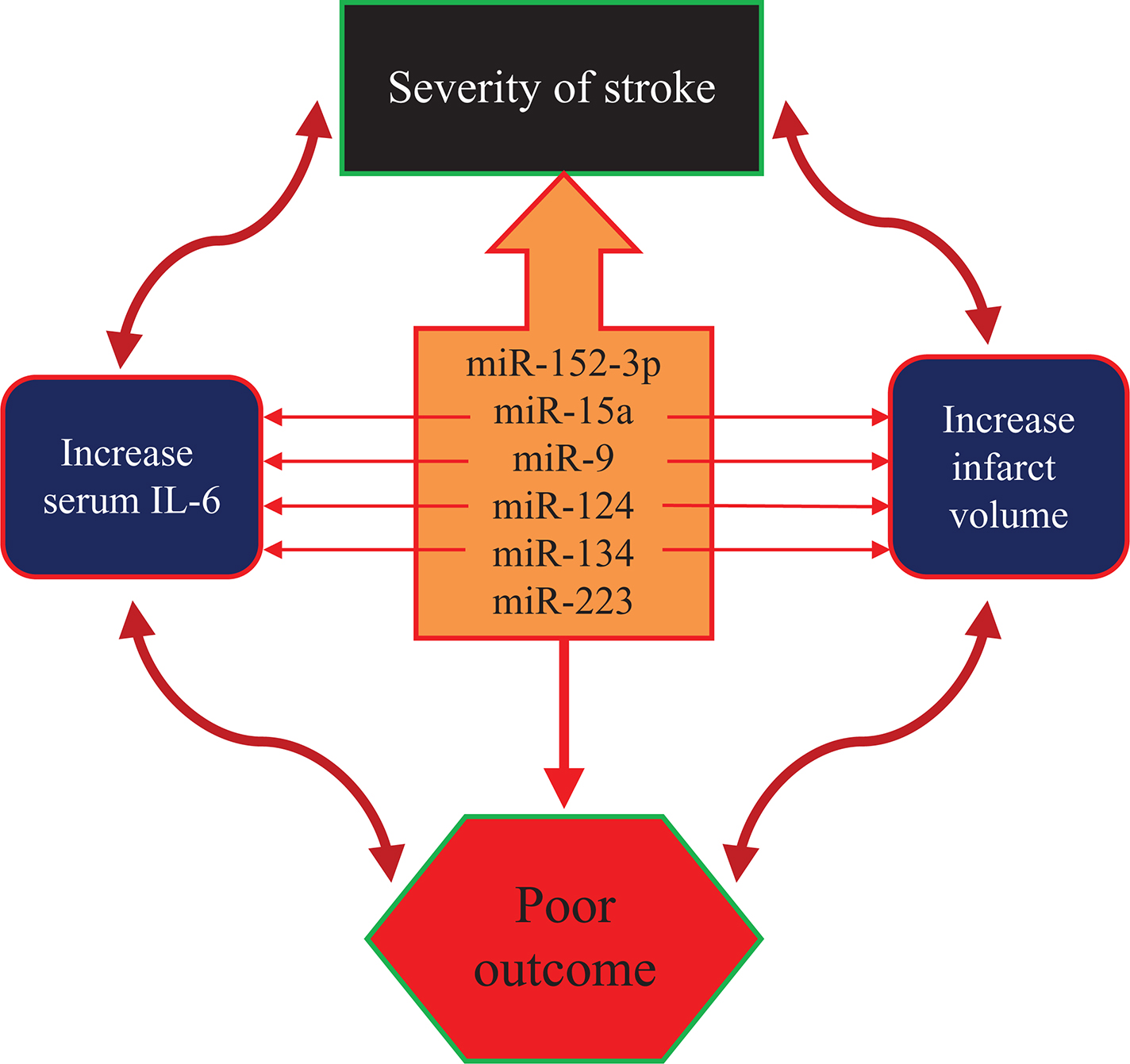 Despite tremendous progress in ischemic stroke research in understanding the molecular processes of early and late sequelae, we still lack drugs or measures to delay or prevent progression, especially post-stroke, and we have still not identified the biomarkers needed for early detection of this condition. A significant breakthrough in the development of such biomarkers is the discovery that microRNAs connect the missing link between cell changes and disease progression. There are many questions about microRNAs in cerebral ischemia that need to be answered, including which specific microRNAs are involved in the cellular changes associated with the pathogenesis and progression of stroke; which specific microRNAs are involved in cellular changes associated with other neurodegenerative disorders and aging; can stroke be prevented, delayed, or arrested through strategic alteration of microRNA expression; and whether and how serum and imaging tests can be developed that will focus on identifying microRNA changes that are responsible for the onset and progression of stroke. Comprehensive microRNA studies are urgently needed to help develop microRNA-based diagnostic tools. At present, because clinical examination may not be decisive and neuroimaging may not be feasible in some cases, non-invasive blood markers are essential in acute ischemic stroke diagnosis. Currently, no commonly recognized markers are available for routine use in the diagnosis, differentiation or stratification of acute stroke risk and its sequelae (69). Thus, microRNAs that are abundantly present in the brain and involved in various neuropathological cellular processes may act as prospective markers that reflect the state and situation of the brain following ischemia (Figure 1) (70). Although many studies have found abnormal levels of microRNAs in acute ischemic stroke patients, a systematic review and meta-analysis is needed to collect and synthesize the available data and thus answer some of the questions. This should be done in addition to many meta-analyzes to comprehensively analyze and summarize the evidence on the influence of circulating microRNAs in the diagnosis and especially in the assessment of the consequences of ischemic stroke. It is expected that the results of these studies will provide clinical evidence as well as the possibilities and future directions of diagnosing and predicting the consequences of ischemic stroke in humans (10).