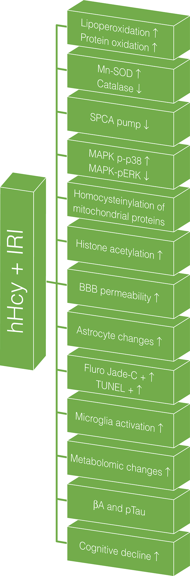 Figure 1. Mechanisms leading to the neurotoxicity in hHcy + IRI conditions. hHcy+IRI-mediated neurotoxicity is the result of a plethora of dysregulated pathways including redox dysbalance, lipoperoxidation, protein oxidation, secretory pathway Ca2+/Mn2+-ATPase, and p38 MAPK. Together, they cause neurodegeneration through a variety of mechanisms including the induction of apoptosis, disruption of the blood brain barrier, β amyloid and Tau accumulation, and alterations in metabolome. (↑), increased number of cells and/or activity; (↓), decreased number of cells and/or activity. βA, beta amyloid; BBB, blood-brain barrier; pTau, phosphorylated tau protein (3, 5, 7, 10, 15, 17–20, 26, 28, 37–43, 46, 53, 54, 58, 62).
