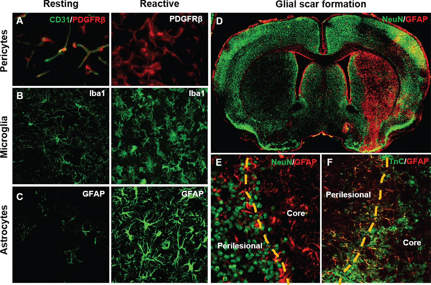 Figure 1. Multicellular reactivity and glial scar formation. A, In the healthy brain, PDGFRβ+ mural cells wrap the vasculature (green) to regulate neurovascular functions. Following ischemia, reactive PDGFRβ+ pericytes detach from the vascular wall and migrate towards the brain parenchyma to adopt fibrogenic properties (×63). B, Microglia are highly ramified cells that react to ischemic insult by upregulating proteins like Iba1 and CD45, while adopting amoeboid morphologies, and populating the injury core as integral building blocks of the glial scar (×63). C, Reactive astrocytes are featured by prominent upregulation of GFAP and prominent cell hypertrophy (×63). D, Following ischemia, reactive astrocytes invade the injury core, where no NeuN+ (healthy) cells are present (×10). E, The cell barrier separates the perilesional tissue to prevent the infiltration of inflammatory signaling to the healthy tissue comprising vulnerable cells that could recover (×20). F, This cell alignment is accompanied by a molecular barrier of fibrotic scar-forming cells as TnC that exerts immunoregulatory and healing roles (×20).