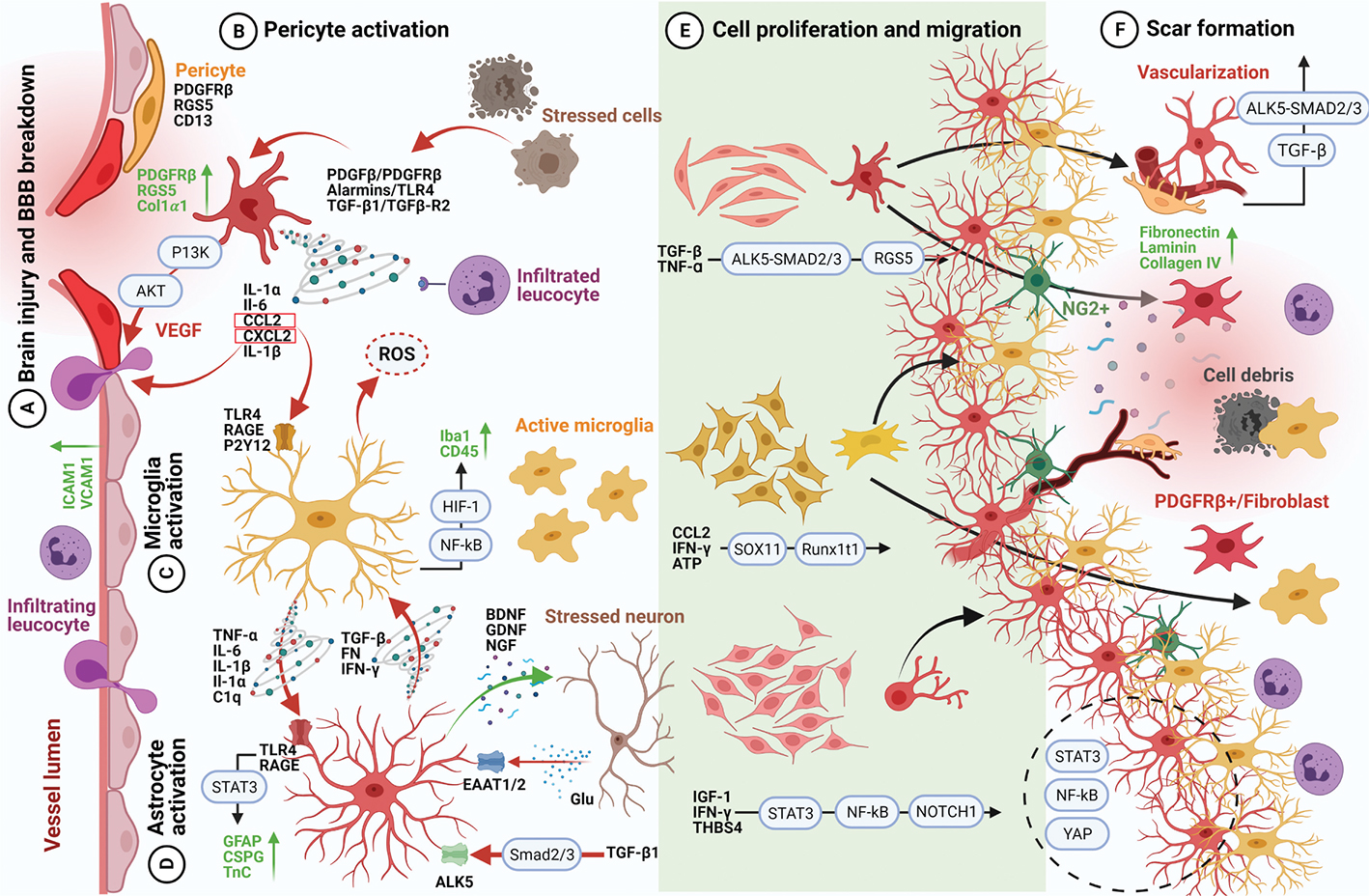 Figure 2. Cellular and molecular pathways implicated in glial scar formation. A, Brain injury upon ischemia leads to blood-brain barrier breakdown and neuroinflammation. B, Mural cells, including pericytes, are among the first cells at the neurovascular unit to respond to injury by secreting diverse inflammatory mediators that trigger glial activation and leukocyte recruitment. C, Microglia respond to pericyte-derived cytokines and damaged cells by adopting an amoeboid morphology to facilitate migration and phagocytosis, and by releasing a second wave of inflammatory cytokines that sustain the inflammatory loop and initiate astrocyte reactivity. D, Astrogliosis, or astrocyte activation, entails the upregulation of glutamate receptors to modulate neuronal excitotoxicity and the deposition of numerous ECM proteins that establish the structure the fibrotic scar. E, Following the initial responses, numerous cells at the neurovascular unit, including PDGFRβ+ pericytes, microglia, and astrocytes proliferate in situ or in the neurogenic zones, and migrate towards the injury core to form the glial scar. F, The glial scar is a stratified arrangement of neuroglia and fibrotic cells that separate the damaged from healthy tissue. This structure relies on the metabolic support offered by endothelial/pericyte-driven revascularization.