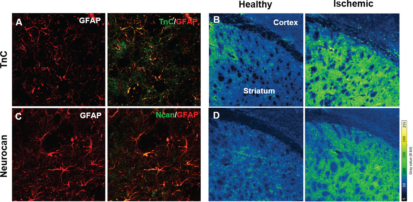 Figure 4. Tenascin-C and neurocan deposition at the fibrotic scar. A-B, TnC is one of the main ECM proteins deposited by reactive astrocytes after cerebral ischemia. Following injury, TnC is prominently upregulated in the injury core (striatum) and is degraded by MMPs (A, ×63; B, ×10). C-D, Neurocan is a CSPG secreted by astrocytes at the injury core, which tightly interacts with TnC and acts as an inhibitory cue for cell reorganization in specific contexts (C, ×63; D, ×10).