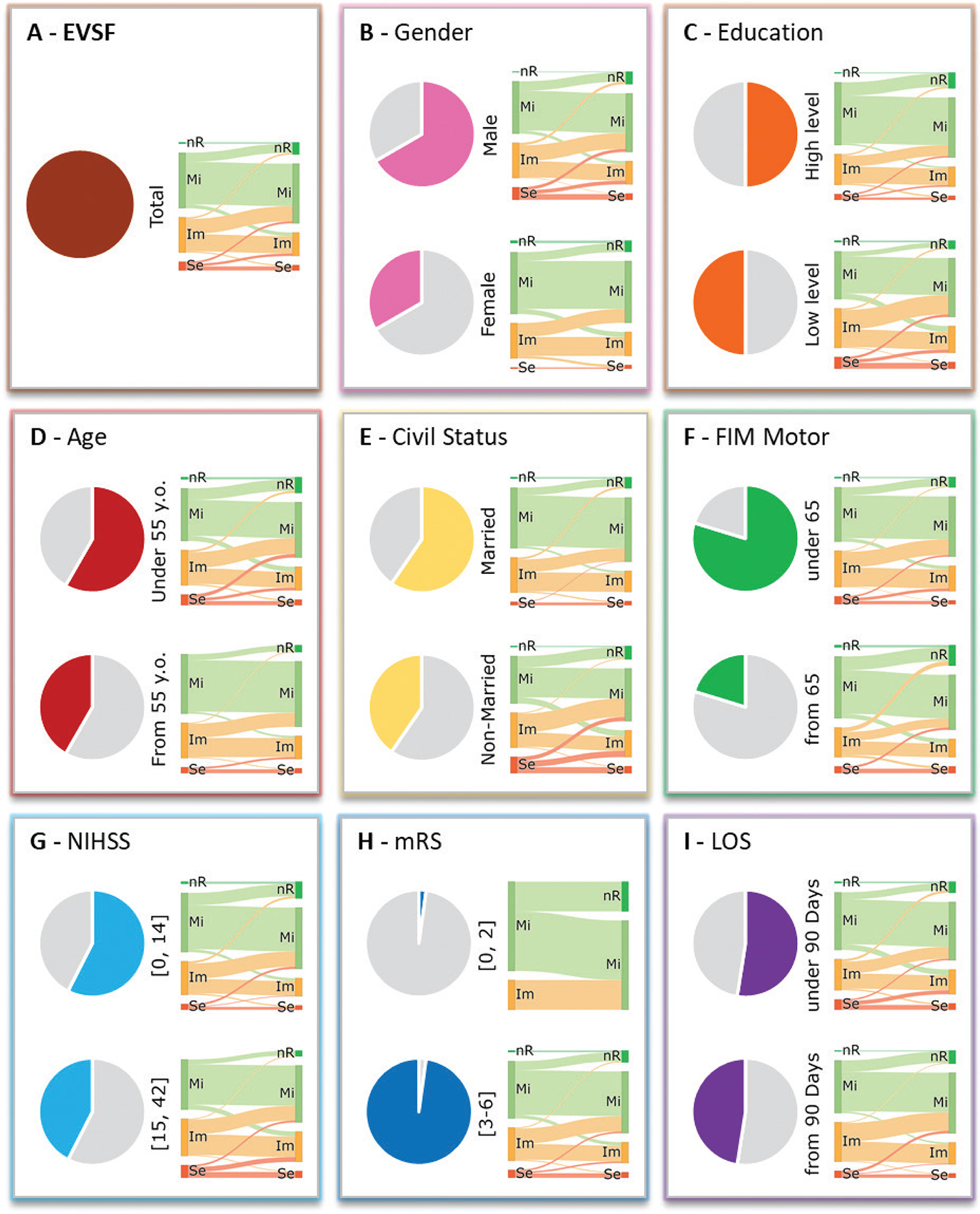 Figure 1. Patient EVSF social risk variation from admission to discharge across four categories: no risk (nR), mild risk (Mi), important risk (Im) and severe risk (Se). A, EVSF risk variation of the studied cohort. B-I, EVSF risk variations of eight factors: gender, education, age, civil status, FIM-motor assessment, NIHSS, mRS assessment, and length of stay (LOS) at the hospital, respectively, with their corresponding cohort distributions.