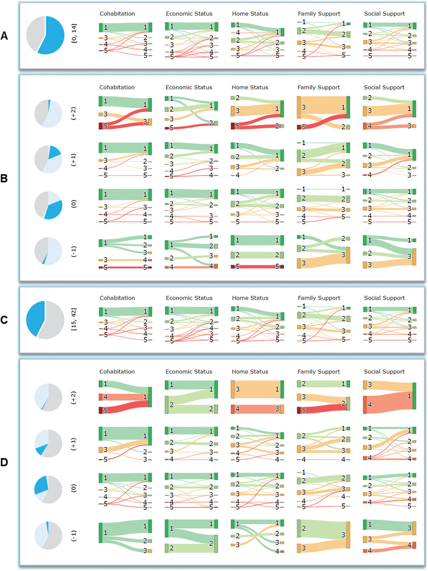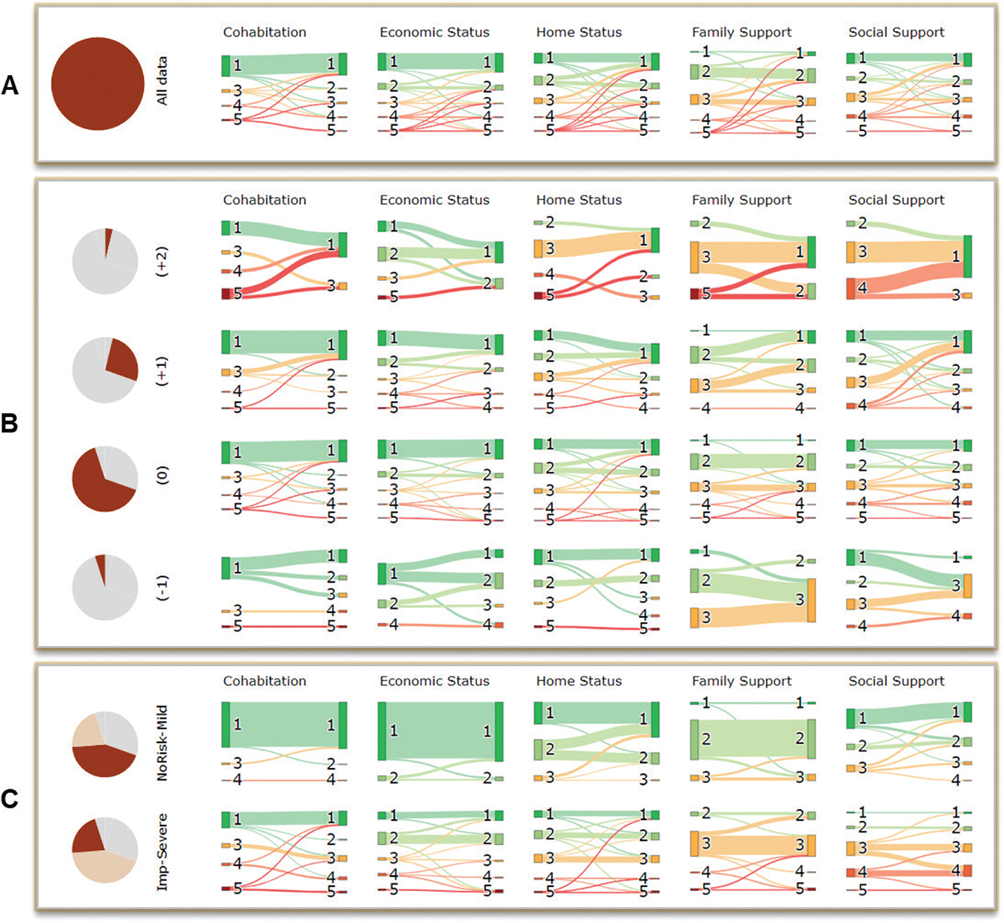Although the overall cohabitation dimension (Figure 2A) scores are mainly low social risk (green), for the improvement level +2 (Figure 2B), this dimension, as well as family support, greatly contribute to the decrease in social risk (red); indeed, in this improvement level, there are no patients in important or severe risk category at discharge (all scores across dimensions are ≤ 3). For the improvement level +1, although some patients were still living alone without relatives at discharge (cohabitation score 5; red) this dimension and the social support dimension greatly contributed to improved social risk at discharge (green). In parallel, for the improvement level -1 (Figure 2B), these same dimensions of cohabitation and social support display an increase in social risk from admission (green) to discharge (orange). Because most patients stay in the same risk category, improvement level 0 was subsequently subdivided into patients belonging to the no risk or mild risk categories, and important and severe risk categories (Figure 2C). As expected, patients in the low-risk categories are in a stable social situation at discharge, with the majority of patients relying on family for support (EVSF score 2; sage-green). However, patients in the high-risk categories would benefit from personalized interventions across all five dimensions, especially family and social support. The Sankey visualizations can aid in ranking of the EVSF dimensions according to each dimension’s possible contribution to overall social risk for the population; for the case study cohort, dimensions contributing to social risk were primarily family support, followed by social support, home status, cohabitation and the least by economic status.