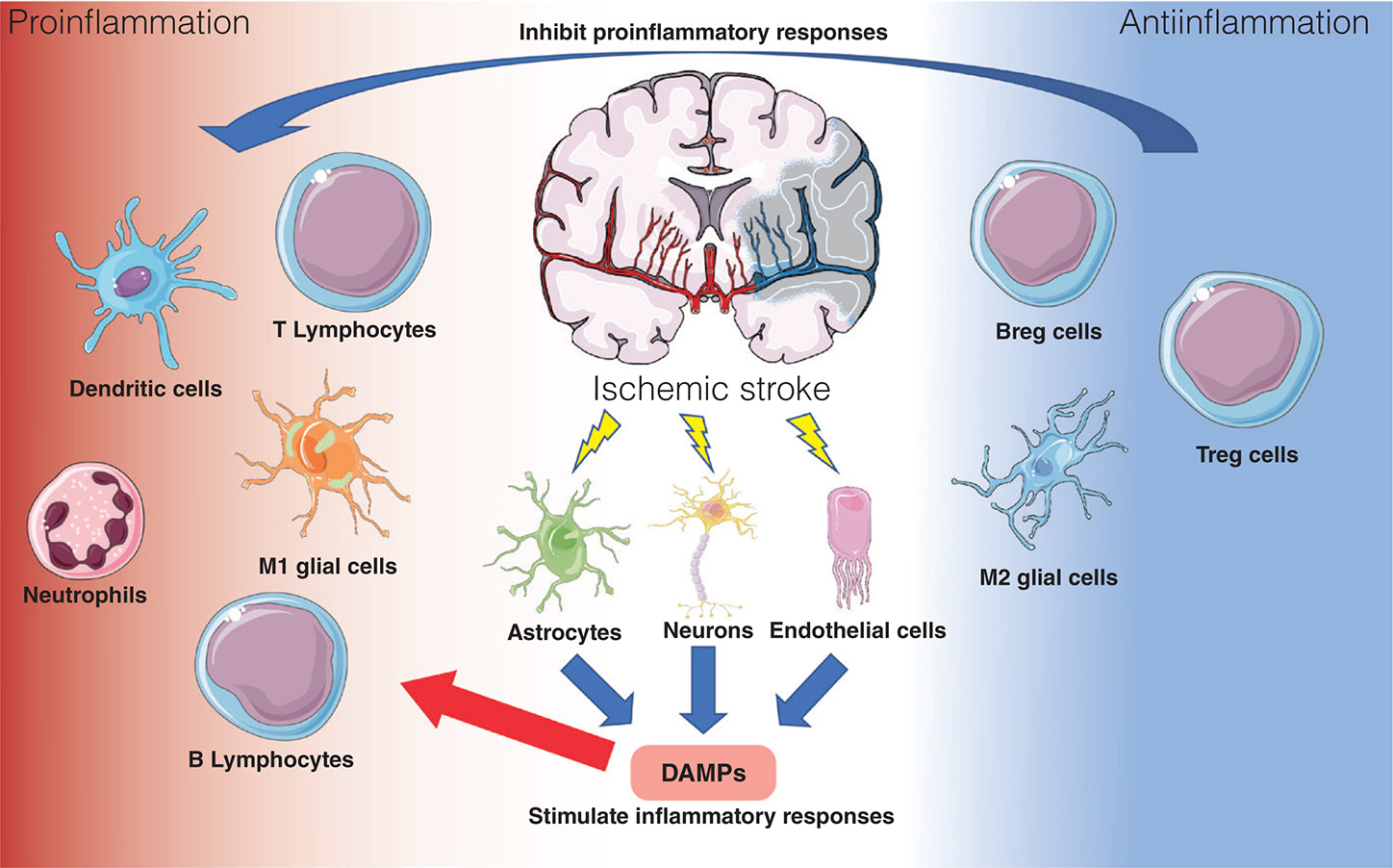 Figure 2. An overview of the different immune cells involved in the pathology of stroke. Neurons, astrocytes and endothelial cells release danger-associated molecular patterns (DAMPs) after stroke. DAMPs activate microglia and peripheral immune cells such as T cells and B cells, yielding a proinflammatory cytokine secretion profile from these cells. Meanwhile M2 microglia, regulatory T cells (Treg) and regulatory B cells (Breg) release antiinflammatory mediators that help reduce neuroinflammation. However, the dual role of inflammation after ischemic stroke is still unclear.