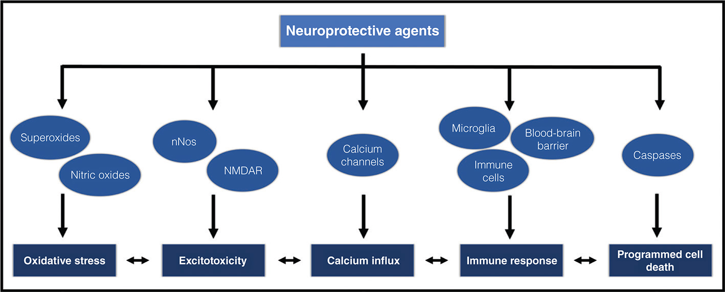 Figure 1. Main targets in acute phase of ischemic stroke by neuroprotective agents. Preclinical neuroprotective candidates mainly target one or more of various key players during the acute stage of ischemic stroke. These targets include oxidative stress, excitotoxicity, calcium influx, immune response and programmed cell death, all of which are tightly interconnected. Examples of particular downstream mechanisms are shown. Abbreviations: nNOS, neuronal nitric oxide synthase; NMDAR, N-Methyl-D-aspartic acid receptor.