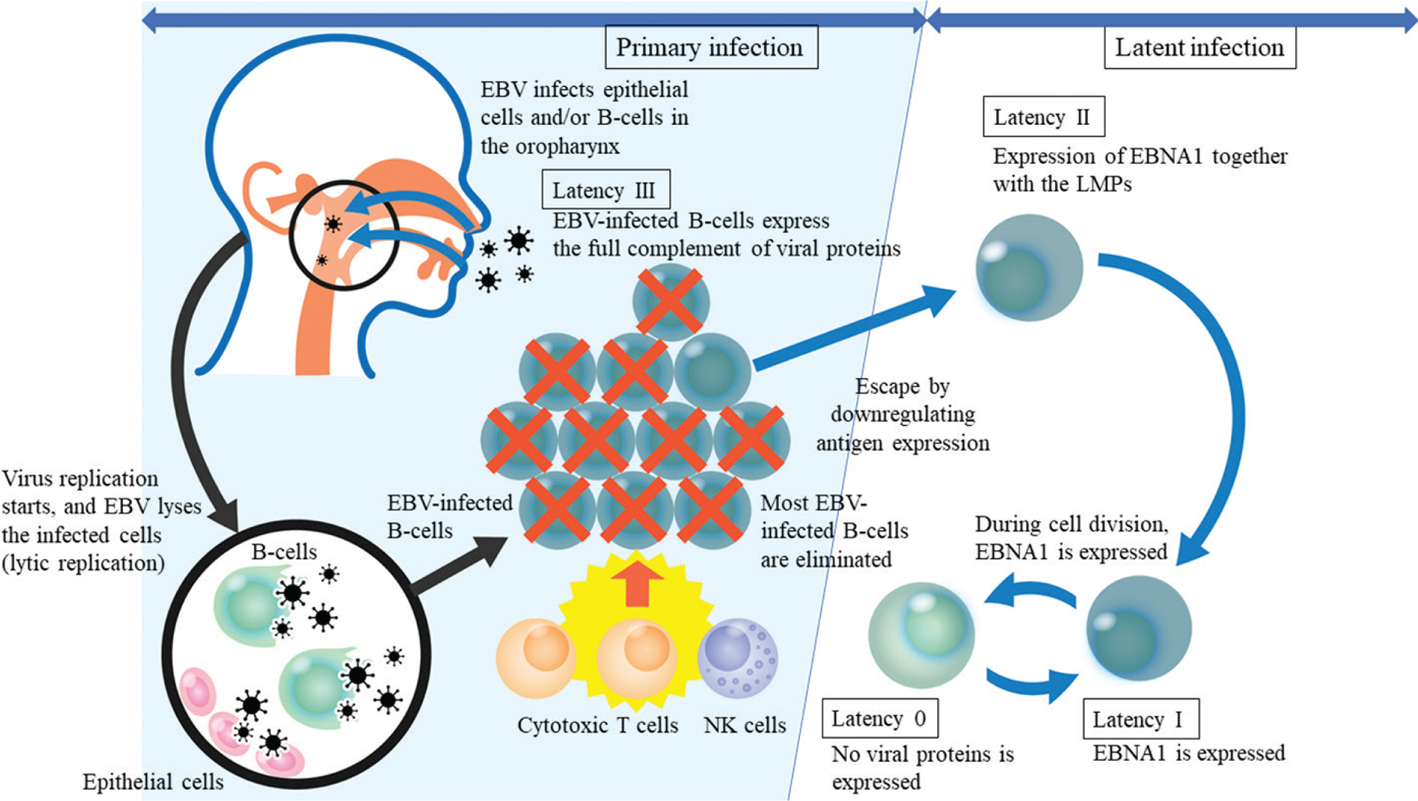 EBV infection has two distinct phases: primary infection and latent infection. In healthy children, primary EBV infection is typically asymptomatic. However, infection in adolescence can present with infectious mononucleosis (9, 10). In primary infection, EBV infects epithelial cells and/or B-cells in the oropharynx. When EBV infects, virus replication starts, and then EBV lyses the infected cells (lytic replication). The infection of B cells by EBV results in latent infection (10). To explain the mechanism of latent infection in detail, most EBV-infected B-cells are eliminated by cytotoxic T cells and NK cells through the antigen-specific T-cell response, but some EBV-infected B cells escape by downregulating antigen expression. Then, they pass through the germinal center and subsequently exit as EBV-infected memory cells (latent infection). Thus, immune T-cell surveillance has a crucial role in controlling persistent EBV infection (10–12).