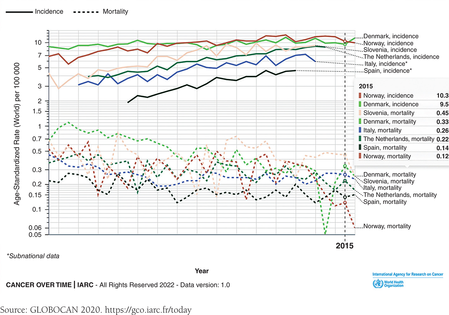 Figure 3. Age-standardized rates and mortality for some of the European countries with highest testicular cancer incidence. Some trends are incomplete due to lack of data available. Period analyzed” 2018-2016.