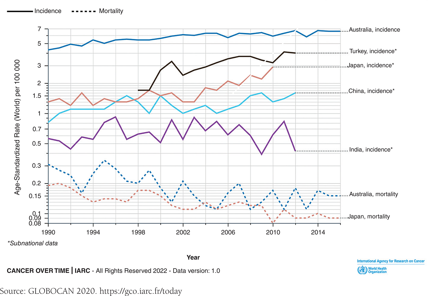 Figure 4. Age standardized rates and mortality for some of the middle east, Asian countries, and Australia. Some trends are incomplete due to lack of data available. Period analyzed: 1990–2016.