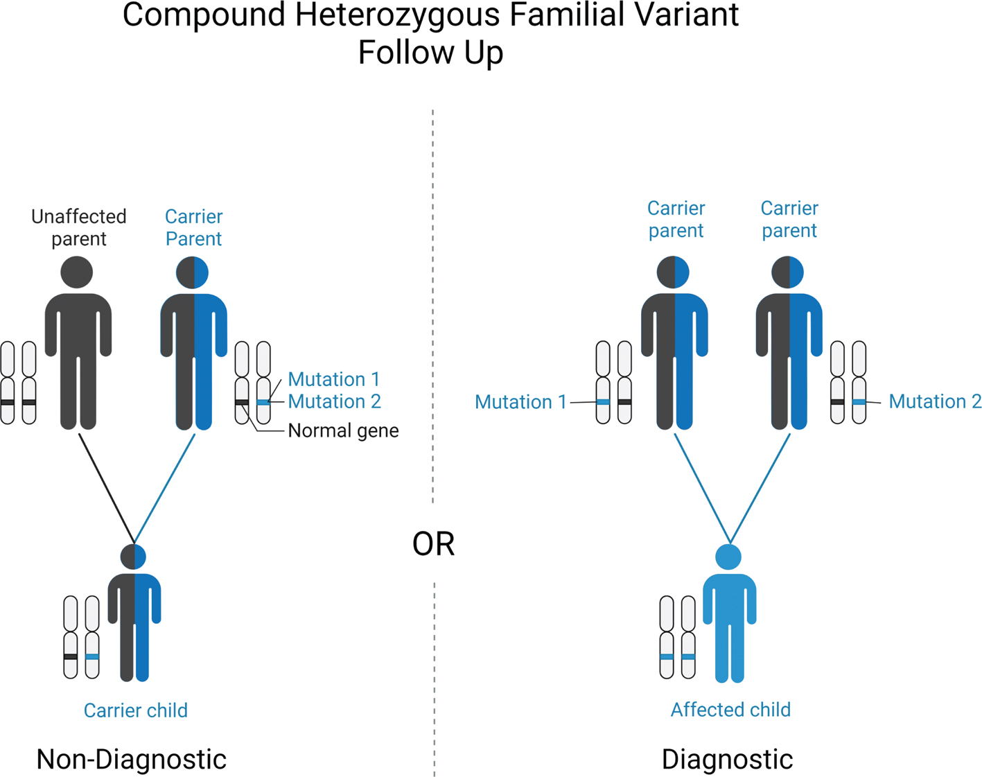 Positive tests results are designated as such when there is a known disease-causing variant in a gene associated with an autosomal dominant condition. Similarly, results are positive if the gene is associated with an autosomal recessive condition and there is either one homozygous disease-causing variant or two compound heterozygous disease-causing variants. Of note, if compound heterozygous variants are identified, it is always advised to test the biological parents to confirm bi-parental inheritance of these variants. If both variants are inherited from the same parent (therefore both gene mutations reside within a single copy of the gene), it would not be considered a positive or diagnostic result (Figure 1). With any positive result, clinical correlation with the condition is suggested.