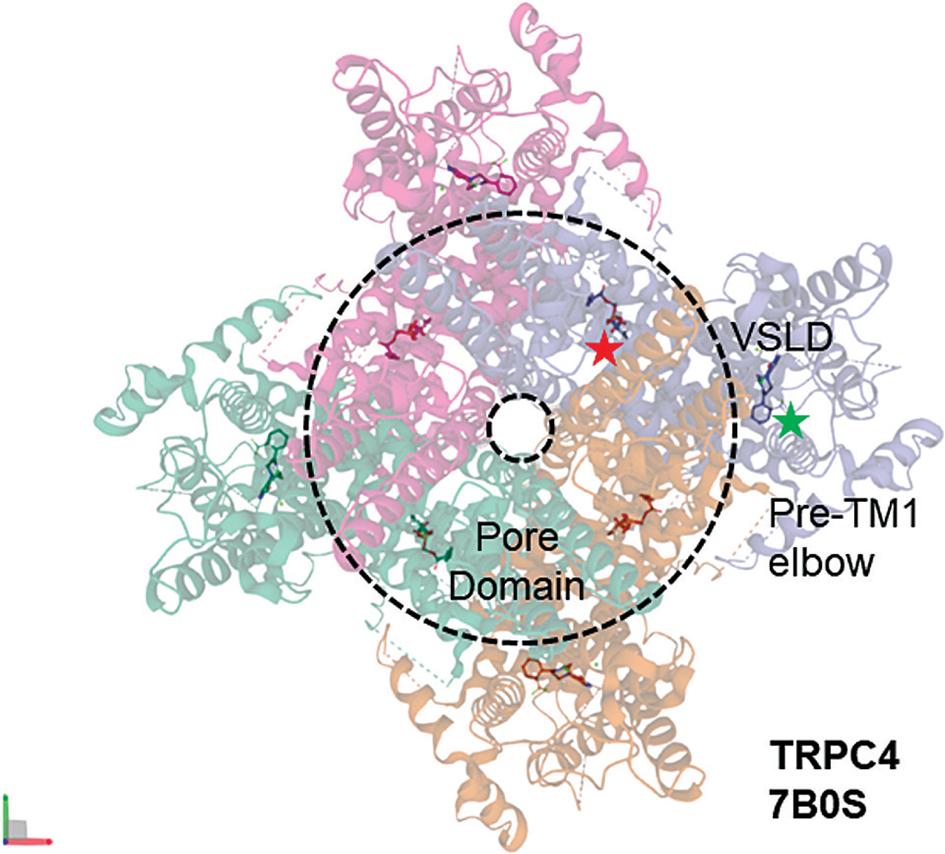 Figure 1. Cryo-EM Structure of TRPC4 (PDB: 7B0S). A top view is shown. Note the lipid binding site (red star) in the pore domain between each subunit, and the modulatory site (green star) in the VSLD domain occupied by GFB-8438