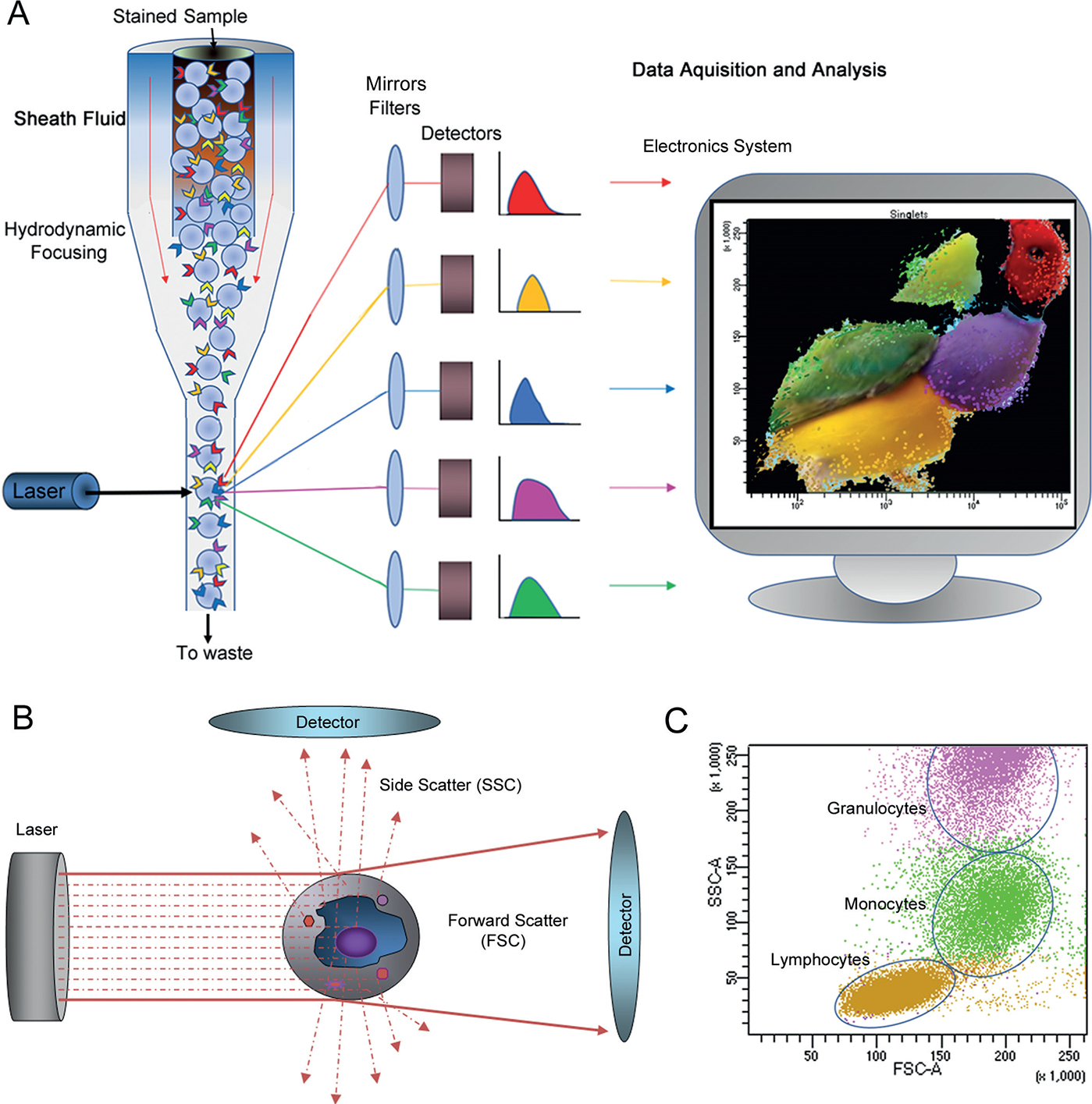 Figure 1. Schematic diagram of how flow cytometry works and light scatter of cells. A, After a liquid sample with stained cells is injected into a flow cytometer, the cells are forced to form a single file stream through hydrodynamic focusing. The cells in a single file stream are illuminated as they travel through a laser beam, and the optical and fluorescence signals of each cell are generated and detected by proper detectors that convert photons to electrical impulses. The electronics system measures the electrical impulses and converts these signals to digital information that is gathered and analyzed by specific software in a computer. B, Illustration of forward light scatter (FSC) and side light scatter (SSC) of a cell. C, Differentiation of peripheral blood leucocytes according to forward and side scatter properties.