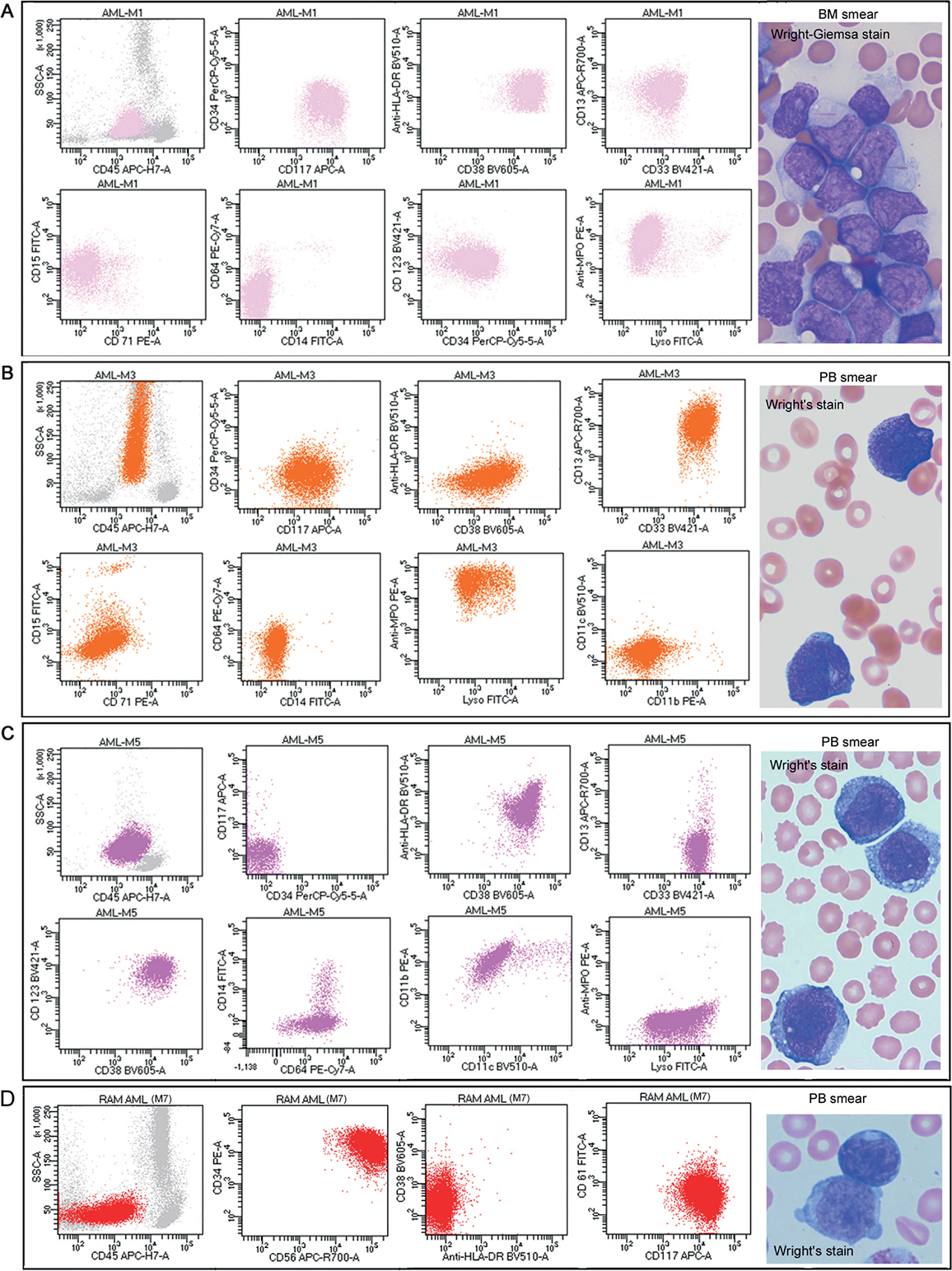 Figure 3. Acute myeloid leukemia. Representative flow cytometry dot plots and cytomorphology of acute myeloid leukemia (AML). A, AML-M1 (light pink) showing low side scatter, dim CD45, expression of CD34 (dim), CD117, HLA-DR, CD38, CD13, CD33, CD15, CD123 and myeloperoxidase (MPO), and no expression of CD71, CD64, CD14 and lysozyme. The blasts are large with irregular nuclei, fine chromatin, prominent nucleoli, abundant cytoplasm with thin single Auer rods and no or sparse granules. B, AML-M3 (acute promyelocytic leukemia) (orange) showing intermediate to high side scatter, intermediate CD45, expression of CD117, CD38, CD13, CD33, CD15 (dim), CD64 (dim and partial), CD71 (partial), MPO, lysozyme (partial), and no expression of CD34, HLA-DR, CD14, CD11b, and CD11c. The leukemic cells are large with round or irregular nuclei, abundant large azurophilic granules and multiple Auer rods (lower cell). C, AML-M5 (magenta) showing low to intermediate side scatter, intermediate to bright CD45, expression of HLA-DR, CD38, CD33, CD123, CD64, CD11b, CD11c, lysozyme, CD13 (small subset), CD14 (small subset), and no expression of CD117, CD34, and MPO. The blasts are large with round or oval nuclei, fine chromatin, inconspicuous nucleoli and abundant basophilic cytoplasm. D, AML-M7 with RAM phenotype (RAM-AML, red) being positive for CD34, CD56 (bright), CD117, CD61 (dim), CD38 (dim to negative), CD45 (dim to negative), and negative for HLA-DR. The blasts are medium to large in size with round or oval nuclei, fine chromatin, inconspicuous nucleoli and cytoplasmic blebs.