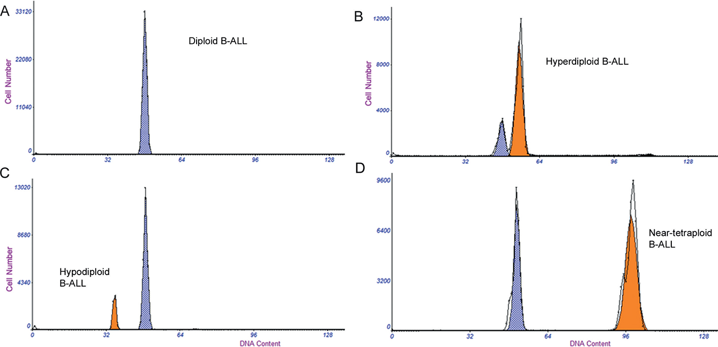 Figure 5. DNA ploidy histogram of precursor B-cell acute lymphoblastic leukemia (B-ALL). A, DNA diploid B-ALL (leukemic cells not separated from normal blood cells). B, DNA hyperdiploid B-ALL (orange color peak, DNA Index = 1.16). C, DNA hypodiploid B-ALL (orange color peak, DI = 0.73). D. Near-tetraploid B-ALL (orange color peak, DI = 1.90).