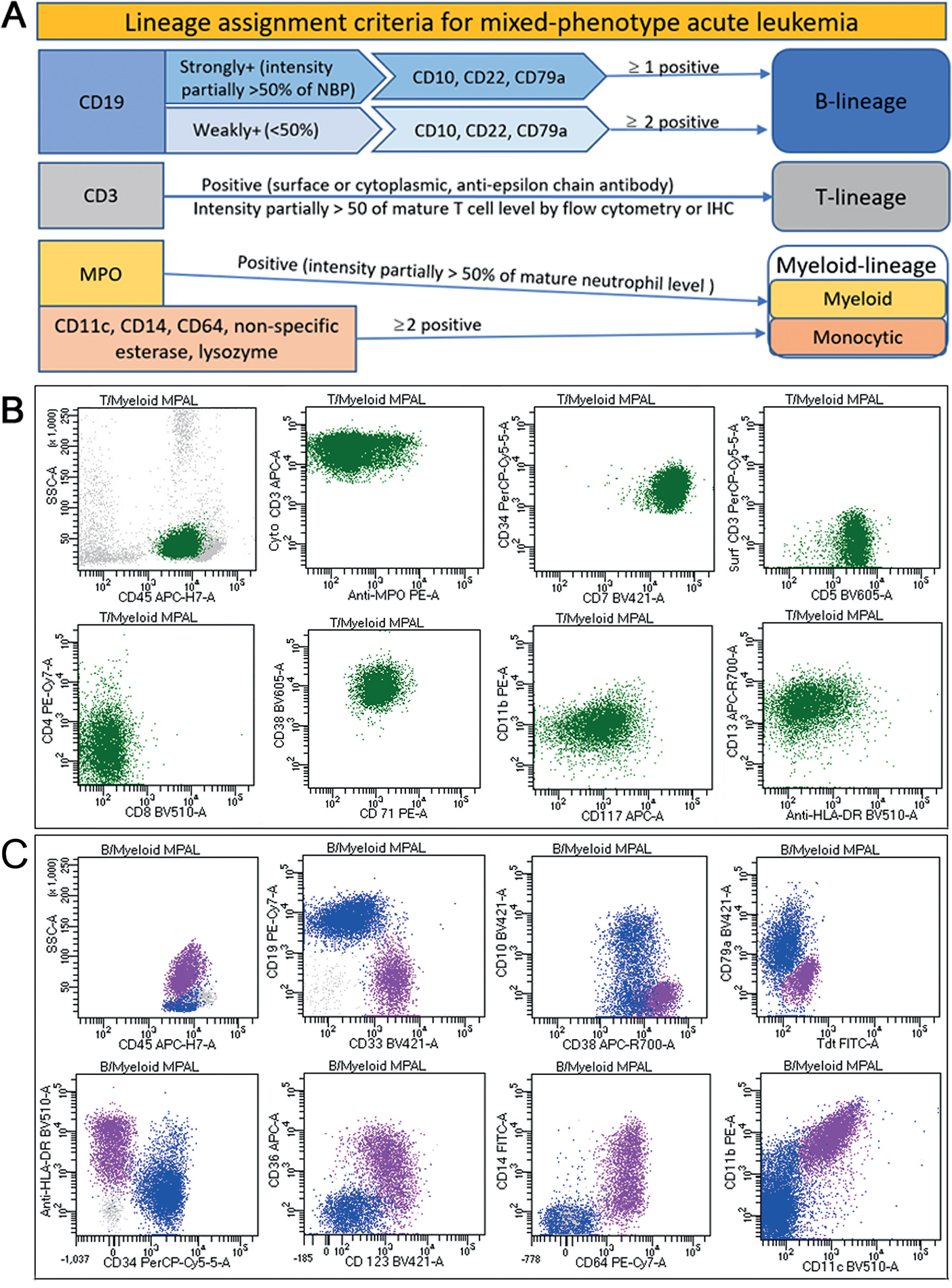 Figure 4. Mixed-phenotype acute leukemia (MPAL). A, WHO lineage assignment criteria for MPAL. NBP, normal B-cell precursor; MPO, myeloperoxidase. B, Biphenotypic T-cell/Myeloid MPAL showing one blast population (green) positive for cytoplasmic (Cyto) CD3, MPO (partial), CD7, CD34, CD5, CD4 (partial), CD38, CD71, CD11b, CD117, CD13, HLA-DR (partial), and negative for surface (Surf) CD3 and CD8. C, Bilineal B-cell/Monocytic MPAL showing two distinct blast populations: one (purple) with low to intermediate side scatter, positive for CD33, CD38, HLA-DR, CD36 (partial), CD123, CD64, CD14 (partial), CD11b and CD11c, and negative for others; the other (blue) with low side scatter, positive for CD19, CD38, CD10 (partial), CD79a, CD34, CD11b (partial), and negative for others.