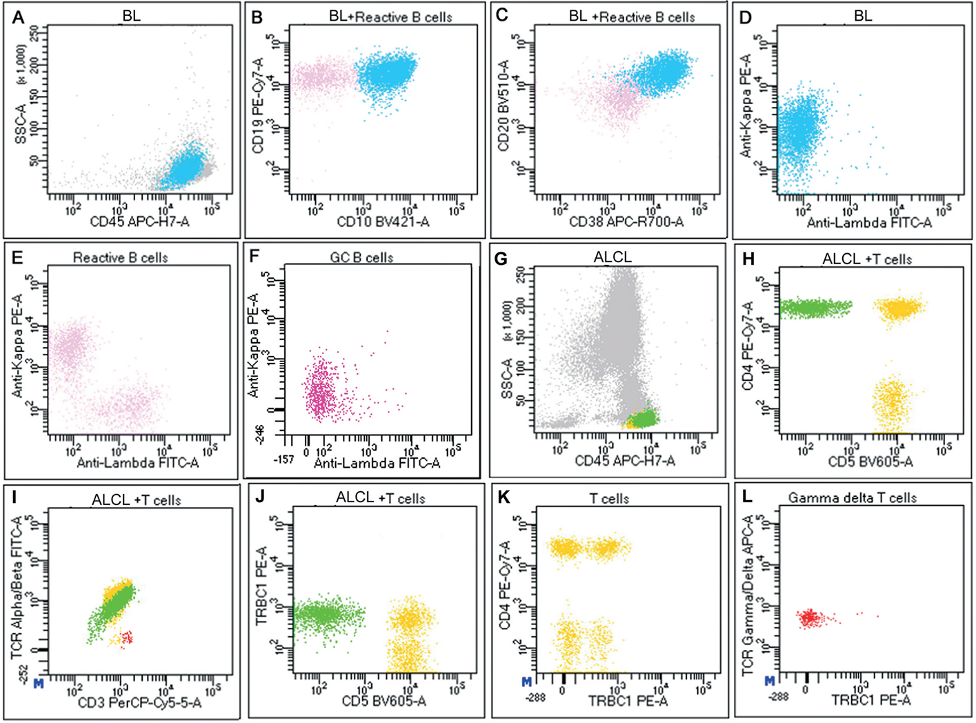 Figure 6. Assessment of clonality of B-cells and T-cells by flow cytometry. Burkitt leukemia (BL, blue) expressing CD45 (A), CD19 and CD10 (B), CD20 and CD38 (C), and showing kappa restriction (D). Reactive B cells (light pink) being polytypic (E). Germinal center B cells (magenta) showing kappa predominance and partial double-negativity for both kappa and lambda in a thyroid FNA sample from a patient with autoimmune thyroiditis. (F). Anaplastic large cell lymphoma (ALCL, green) being CD45+ (G), CD4+ and CD5-(H), TCR alpha beta+ and CD3+ (I), and expressing TRBC1 only (monotypic, J). Reactive CD4+ and CD4- T cells (golden) containing mixed TRBC1+ and TRBC1- populations (polytypic, K). Gamma delta T cells (red) always negative for TRBC1 (L).
