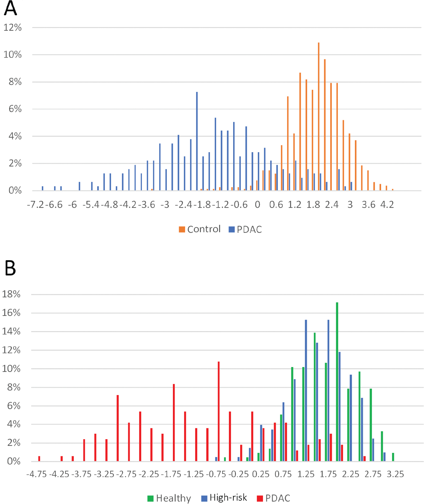 A histogram showing the distribution of decision values for the three sample cohorts is shown in Figure 3A. The decision values for the healthy and high-risk cohorts are clustered and are generally similar to one another (although they were statistically different by t test, p < 0.001). The mean decision values for the high-risk and healthy cohorts are 1.40 and 1.65, respectively. The corresponding standard deviations were 0.67 and 0.68. Both cohorts differed substantially from the pancreatic ductal adenocarcinoma cohort that showed a much greater variation in decision values (−4.75 to 2.5) and had a strong negative bias (mean value = −1.26 with a standard deviation of 1.58).