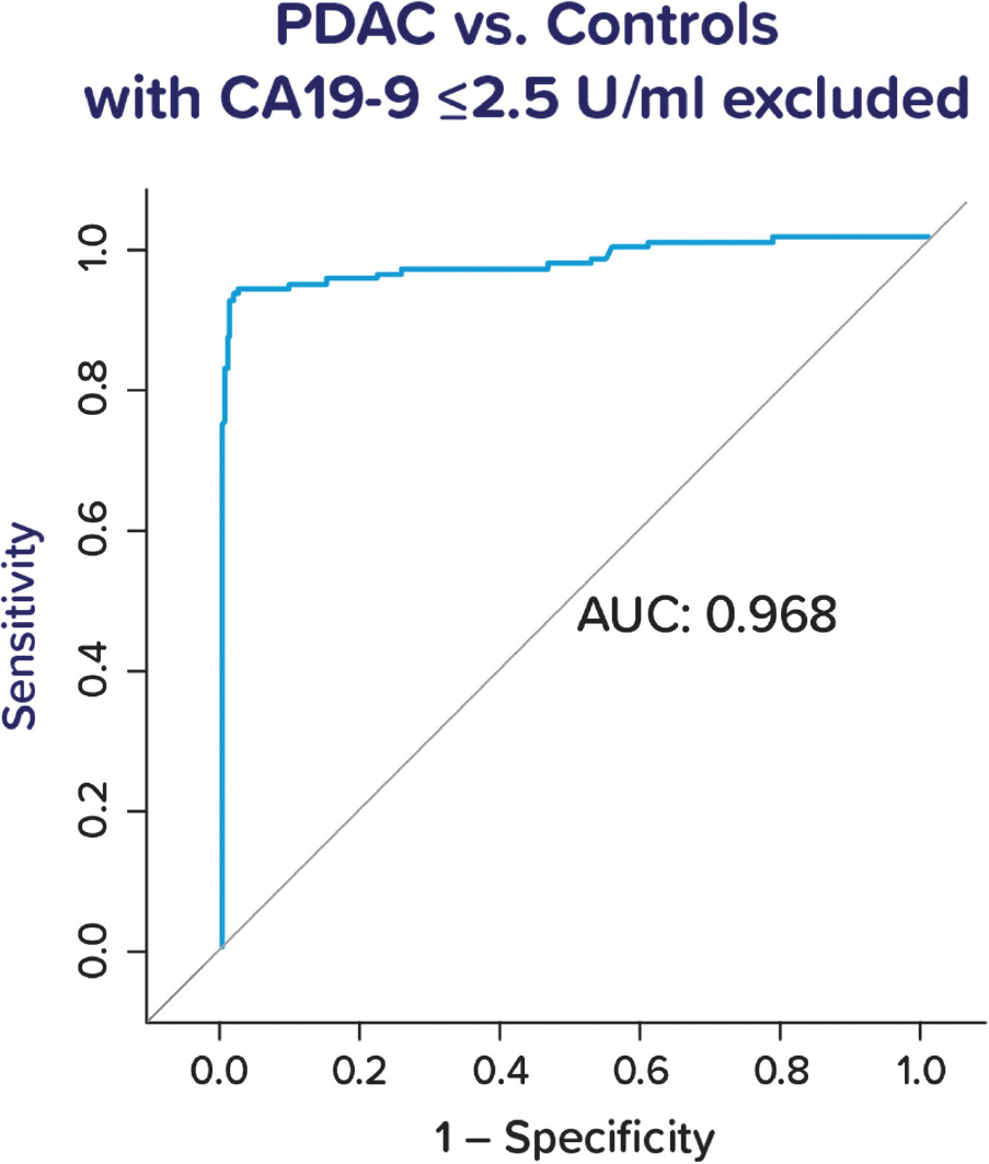 Figure 4. Test performance. Receiver operating characteristic (ROC) curves and area under the curve (AUC) for IMMray™ PanCan-d test performance in pancreatic ductal adenocarcinoma (PDAC) vs all controls, excluding samples with CA19-9 values of 2.5 U/ml or less.