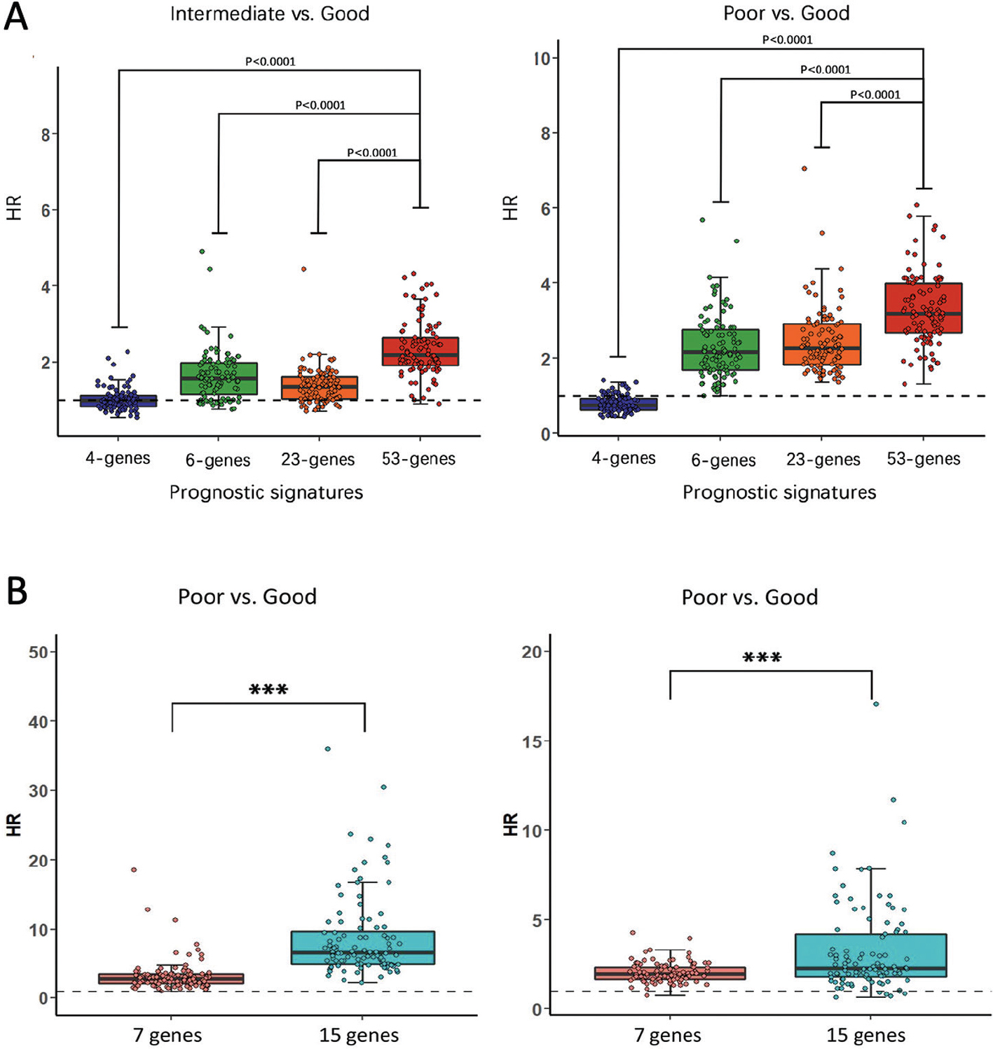 Figure 3. Comparison of the prognostic performance of our signatures with existing prognostic signatures in gastric cancer and colorectal cancer patients. For both signatures, the hazard ratio values of all the 100 test sets were calculated using a Cox model based on the prognostic score between groups. A. The differences between the 53-gene signature and other three signatures (13–15) were significant for both the intermediate vs. good and poor vs. good groups (p<0.0001, Mann-Whitney U test). This figure is taken from reference 16 with permission. B. Comparison of the 15-gene signature with the 7-gene Oncotype DX colon cancer signature. The comparison was made using the hazard ratio values obtained from 100 test sets between our 15-gene signature and the 7-gene panel in GSE17536 (A) and GSE28722 (B). For each of these datasets, the hazard ratio values calculated for poor vs. good were plotted. *** indicates P < 0.001 in Wicoxon test. This figure is taken from reference 21 with permission.