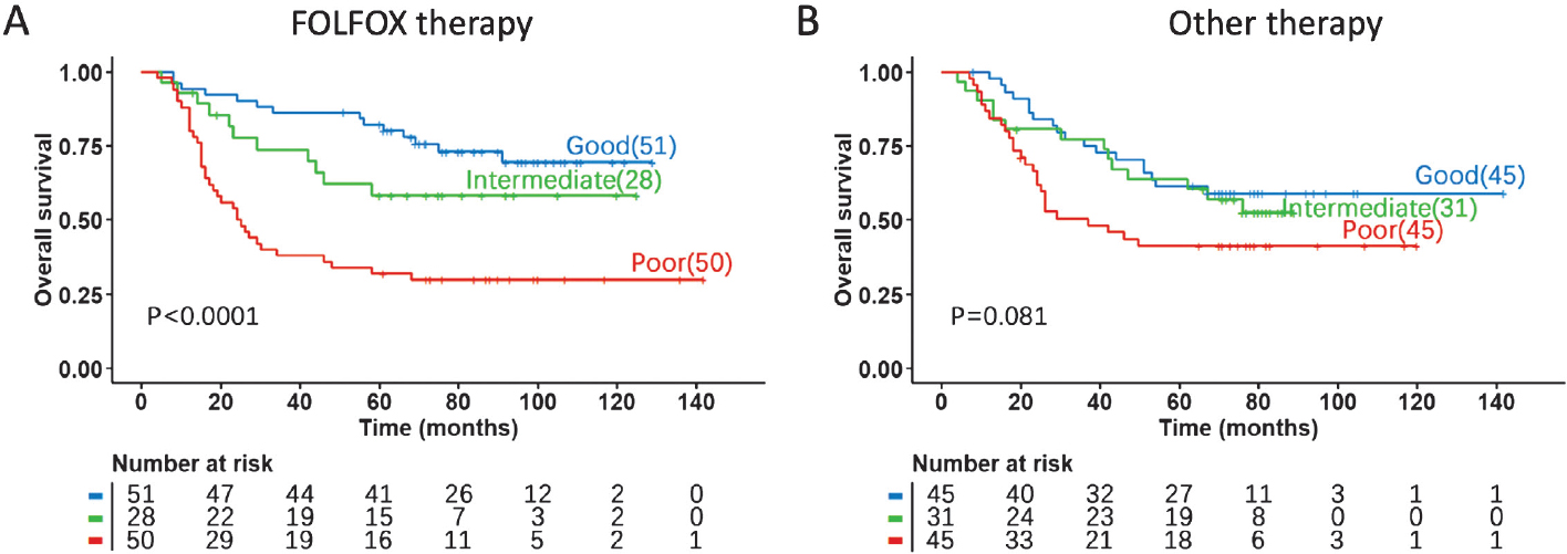 Figure 4. The predictive value of the 53-gene prognostic score in gastric cancer chemotherapy. The Kaplan-Meier curves and P values of overall survival in two different chemotherapy groups were plotted. A, Patients with FOLFOX; B, Patients with other first-line drugs/regimes. The P-values were obtained by log-rank test. This figure is taken from reference 16 with permission.