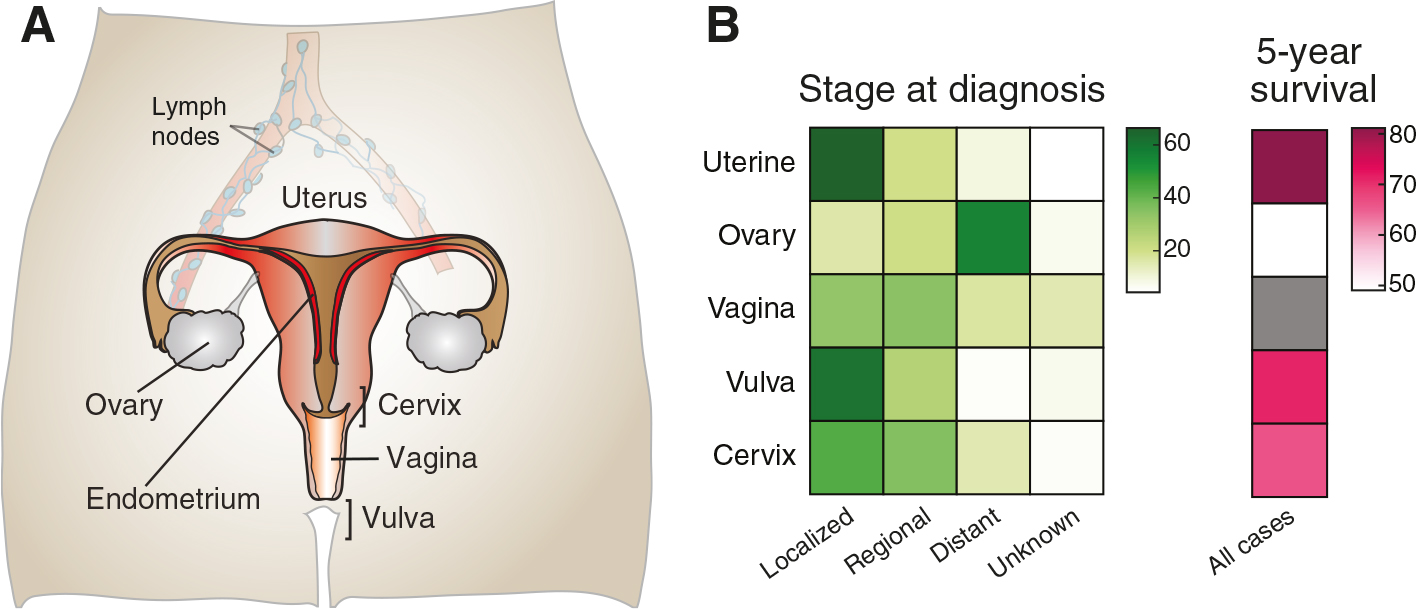 Figure 1. The female reproductive system, cancer stages and 5-year survival for gynecological cancers. A, Schematics of the female reproductive system. B, Data from the Surveillance, Epidemiology, and End Results (SEER) Program at the National Cancer Institute (NIH) comparing stages of disease at diagnosis and 5-year survival in gynecological cancers observed in the U.S. population. Relative numbers in percent for cancer stages (green) and 5-year survival (pink) for gynecological cancers. Grey box; missing data.
