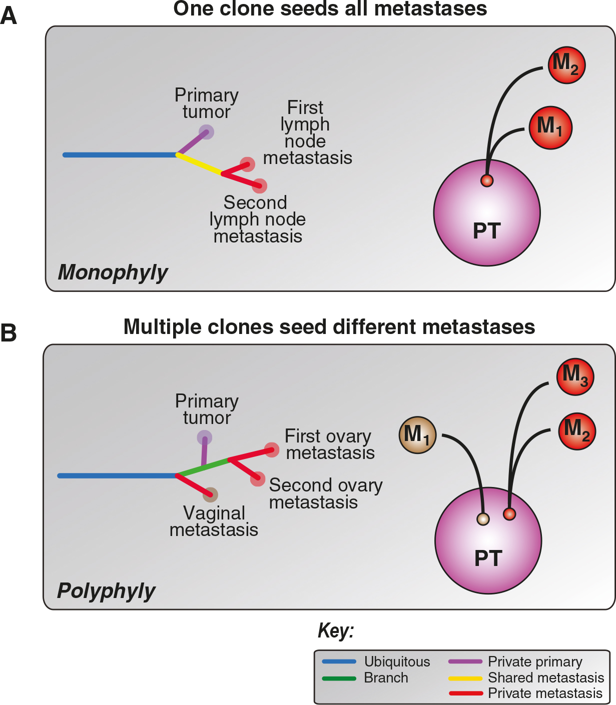 Figure 3. Phylogenetic models of endometrial cancer. Two alternative scenarios describe the origin of multiple metastases in endometrial cancer. A, The monophyly model suggest that the origin of metastases (Ms) are from the same ancestral origin, as a subclone or a single cell of the primary tumor (PT). B, Alternatively, multiple clones seed the different metastases in the polyphyly model. Current data has demonstrated that the monophyletic model is the dominating and most likely route of metastatic spread (29,46). Tumor evolutionary phylogenetic trees constructed from somatic mutations are displayed to the left, with accompanying models to the right.