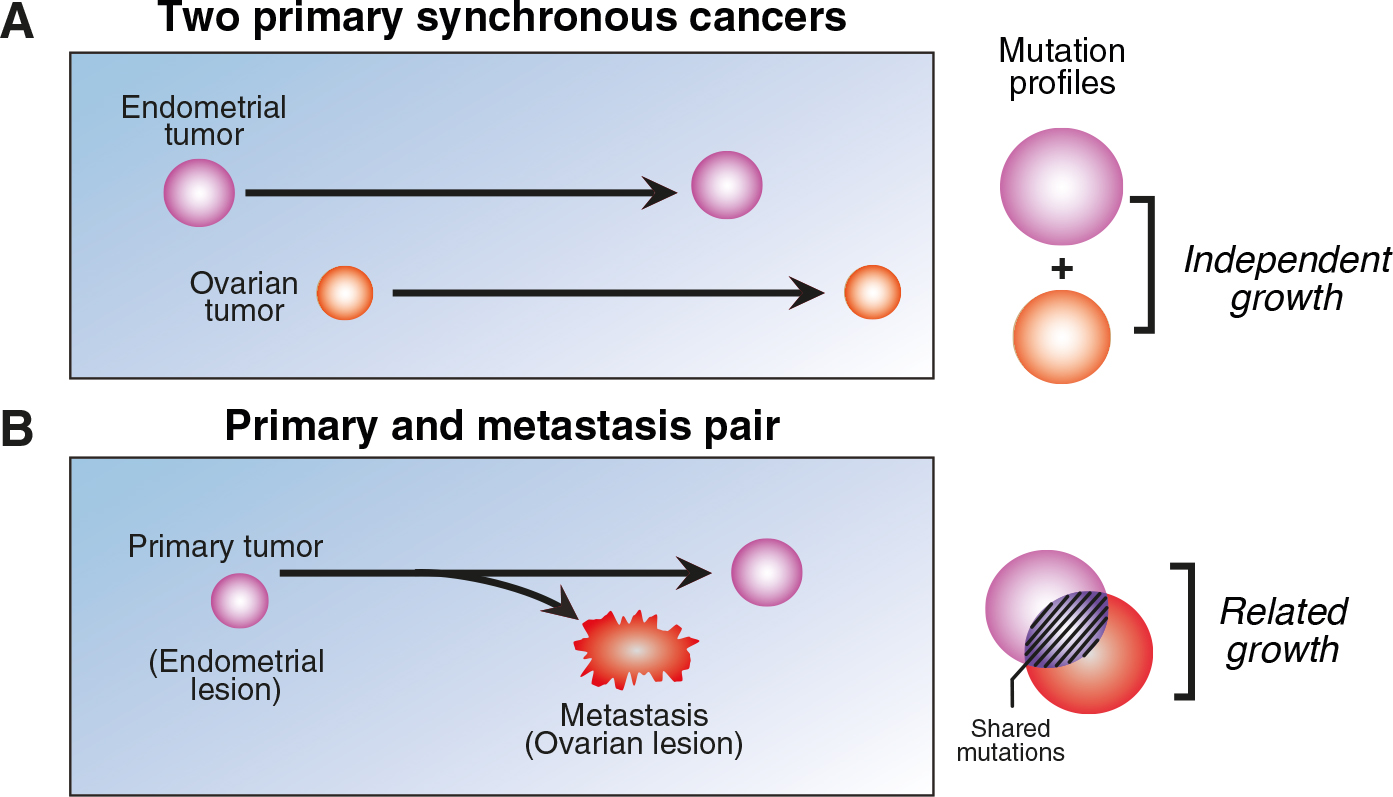 Figure 4. Independent primary synchronous cancers versus metastatic growth. Possible interpretations of simultaneous endometrial and ovarian lesions A, Independent growth of two primary tumors of the endometrium and the ovary, suggestive of synchronous cancers (no shared genomic features). B, Related growth by endometrial and ovarian tumors with shared mutational profiles, demonstrating relatedness and suggestive of a primary tumor-metastasis relationship. Multiple studies of apparently synchronous cancers are supportive of the latter model (29, 51–55).