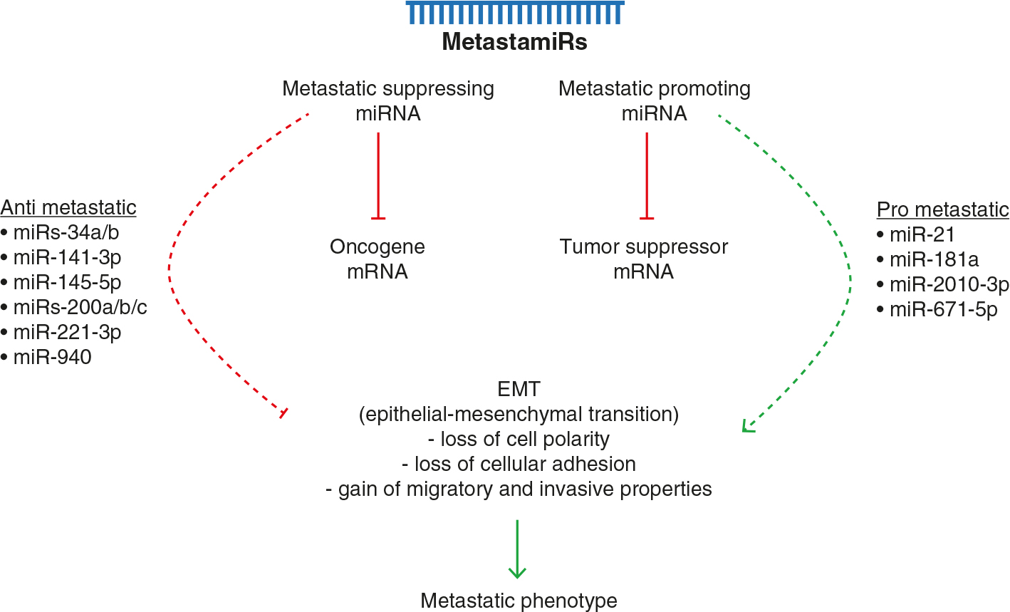An area of interest with respect to the impact of miRNA expression on human disease is cancer progression (5). MiRNAs frequently become dysregulated in human cancers through mechanisms such as amplification or deletion of miRNA genes, aberrant transcriptional control of miRNAs, changes in epigenetic regulation and defects in the miRNA biogenesis machinery (6). It has been shown that miRNA dysregulation has a strong influence on the following aspects of cancer phenotype: proliferative capacity, resistance to apoptosis, evasion of growth suppressors, activation of invasion and metastasis via the epithelial-mesenchymal transition (EMT) pathway, and induction of angiogenesis (6). The miRNAs involved in the overall cancer phenotype have been termed “oncomiRs” (7), and their role in the regulation of these processes depends on their interactions with specific targets. MiRNAs that affect the metastatic phenotype when dysregulated can be characterized as having pro- and anti- metastatic effects depending on their net influence on tumor aggressiveness (8). The collection of miRNAs that are specifically associated with the promotion or suppression of metastatic potential and EMT of cancer cells are known as “metastamiRs” (8).