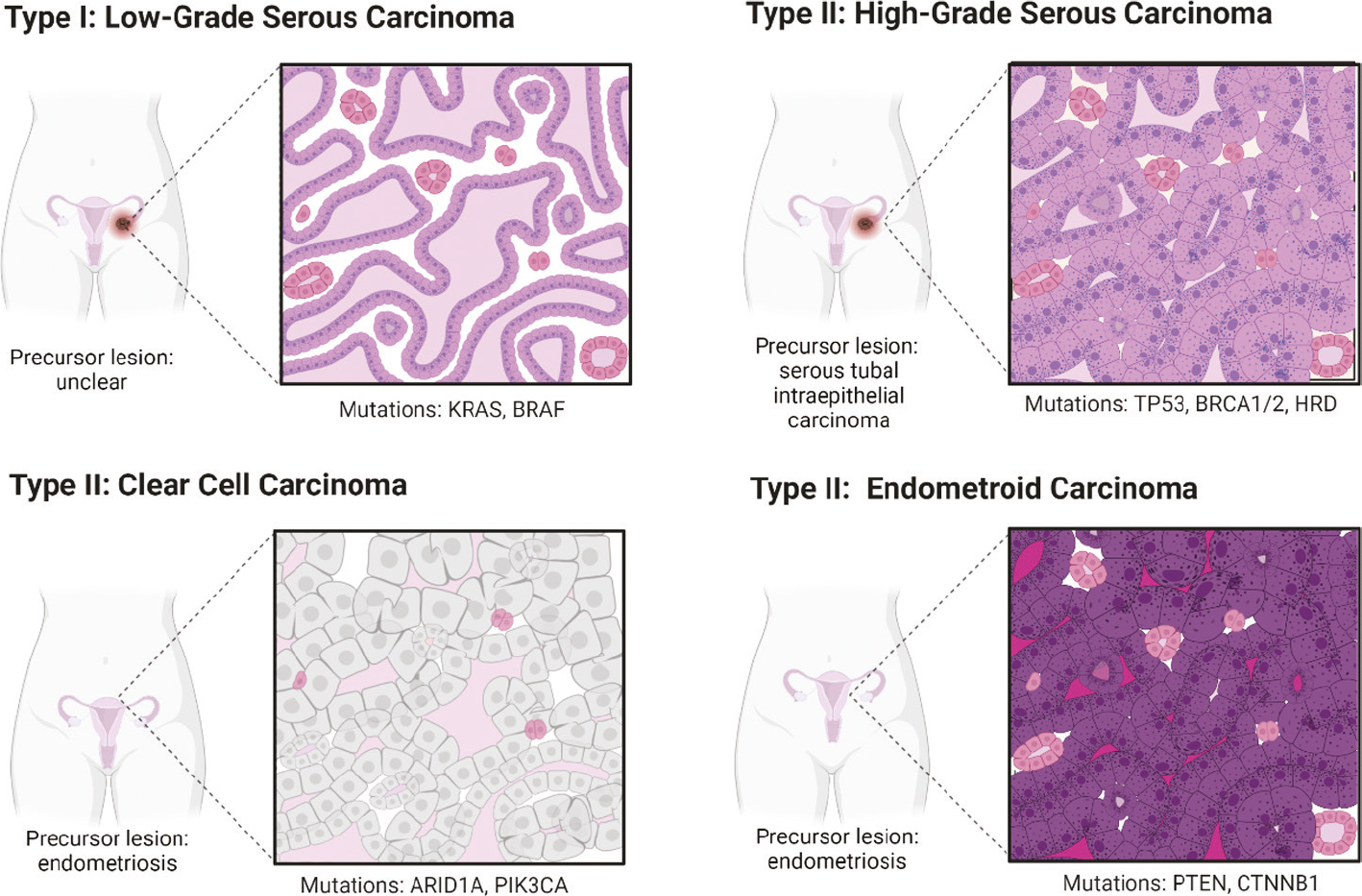 Figure 2. Common types of epithelial ovarian cancer. Epithelial ovarian cancers are classified into type I and type II. Type I cancers are described as low grade and chromosomally stable with a lower likelihood of metastasis and higher cure rates. Type II cancers are described as high grade and chromosomally unstable with a higher likelihood of metastasis and lower cure rates. Adapted from “Ovarian Carcinoma Histology,” by BioRender.com (2022). Retrieved from https://app.biorender.com/biorender-templates. Created with BioRender.com. Used under BioRender’s Academic License Terms.