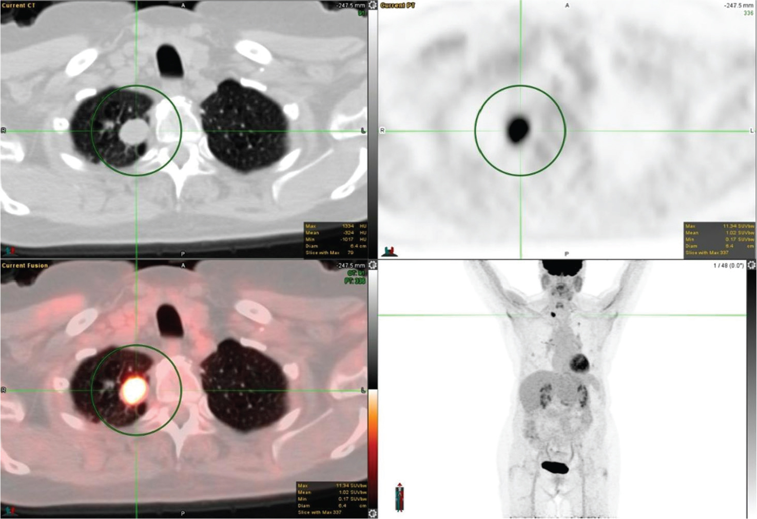 Fluorodeoxyglucose positron emission tomography in combination with computed tomography (FDG PET/CT) plays a well-recognized role in oncology, especially in the evaluation and management of thoracic tumors (1). Lung cancer is the common fatal malignancy in men and women and more than 50% of primary lung cancer patients have metastasis at the time of diagnosis. Therefore, it is essential to stage and evaluate patients with lung cancer before starting appropriate therapy. Molecular imaging has various roles in the staging, treatment planning, response assessment, and restaging of lung tumors. The prompt and accurate characterization of solitary pulmonary nodules by imaging is mandatory, as it contributes approximately 20% of primary lung tumors (2, 3).