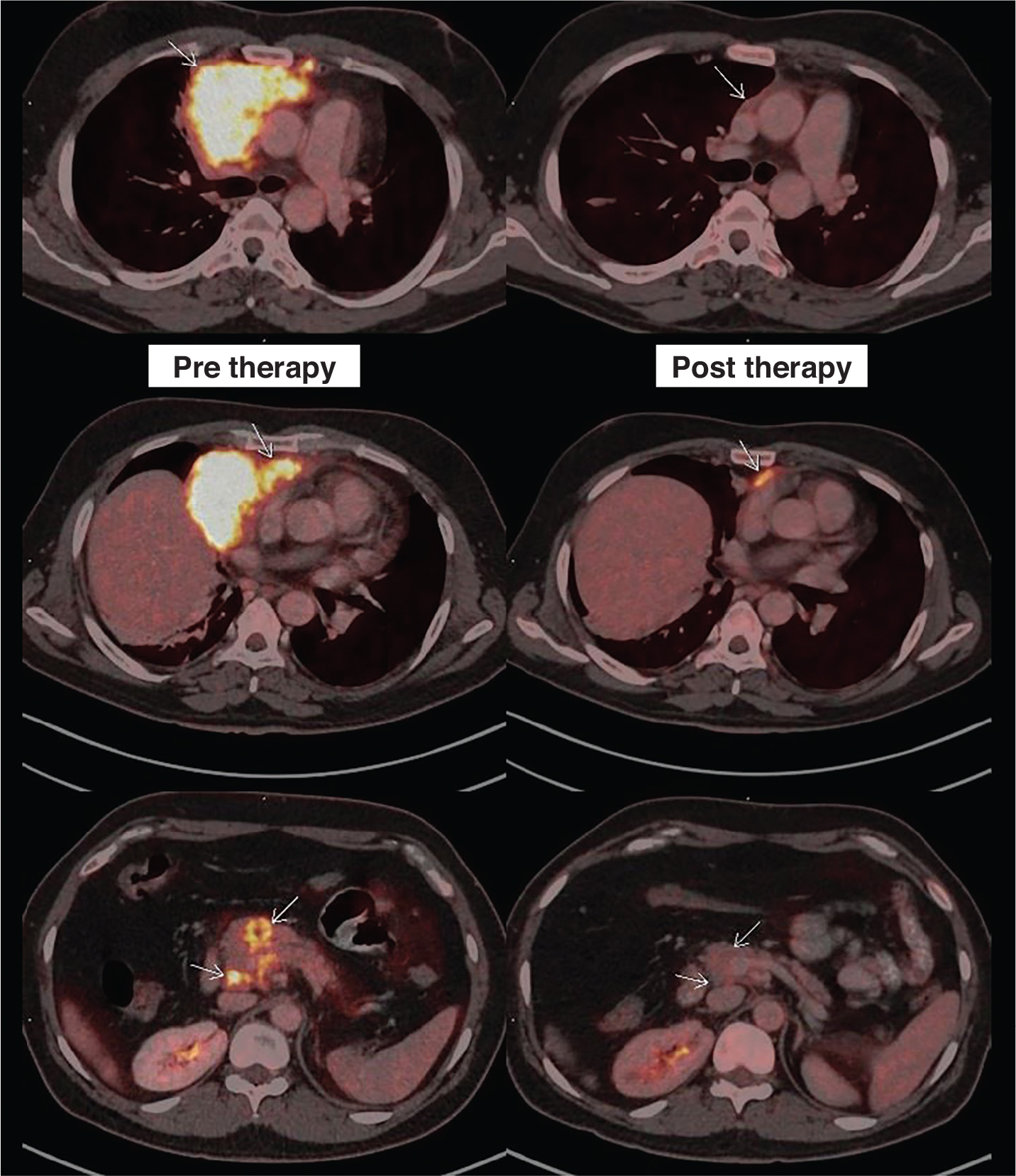 Figure 5. Staging and interim response assessment 18F-FDG PET/CT scans. 18F-FDG PET/CT images include fused axial PET/CT of the patient taken during staging on the left column and interim response assessment after 3 cycles of chemotherapy on the right column (comparative lesions marked with small white arrows). First row showing complete resolution of the bulky component of the disease. Second row showing persistent minimal metabolically active residual disease (Deauville’s score 4) abutting the pericardium and third row showing complete resolution of the pancreatic lesion and adjoining peripancreatic lymph node.