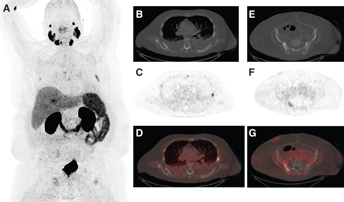 Figure 2. An 82-year-old man with metastatic prostate cancer, but with limited PSMA expression of disease, ineligible for 177Lu- PSMA-617 RLT. A. Maximum intensity projection image of 18F-PyL PSMA PET/CT; B. axial CT image of the chest demonstrating one osteoblastic rib lesion and mild uptake in the sternal body and a right-sided rib; C. axial PSMA PET image demonstrating uptake related to the osteoblastic rib lesion and mild uptake in the sternal body and a right-sided rib; D. fused PET/CT images of B and C; E. axial CT image demonstrating an osteoblastic right iliac bone lesion; F. PSMA PET image demonstrating limited uptake associated with the osteoblastic lesion; G. fused images of E and F.