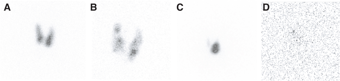 Figure 1. Distribution of RAI in different types of hyperthyroidism. A, Graves’ disease; B, Toxic multinodular goiter; C, Autonomously functioning nodule; D, Thyroiditis.