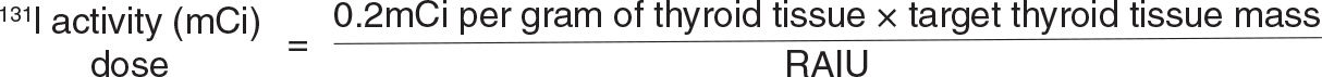 Prior to RAI therapy, an uptake and scan are needed to identify if the patient’s hyperthyroidism is related to an etiology that takes up iodine. Some patients may have hyperthyroidism related to thyroiditis (multiple etiologies, Table 1) that will decrease in function over time or ‘burn out’. Treatment for these patients is supportive, aimed at the etiology of their cause of thyroiditis, and radioiodine is not indicated. Patients who may be treated with RAI for benign causes fall into three groups: (i) hyperthyroidism related to Graves’ disease; (ii) hyperfunctioning thyroid nodule, also called autonomously functioning nodule or toxic nodule; and (iii) toxic multinodular goiter. Optimal therapeutic dose can be achieved in different ways, although in general RAI dose is inversely related to the degree of thyroid uptake of radioiodine and the specific etiology of hyperthyroidism. For example, some institutions start with a dose of 8-15 mCi for Graves’ disease, 25 mCi for an autonomously functioning nodule, and 30 mCi for toxic multinodular goiter. A more individualized approach based on the patient’s thyroid mass and uptake can also be calculated as in Figure 2 (2).