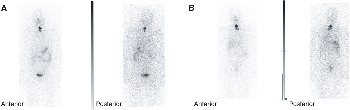 Figure 3. Examples of I-123 whole-body scans (A) and I-131 post-therapy scans (B).