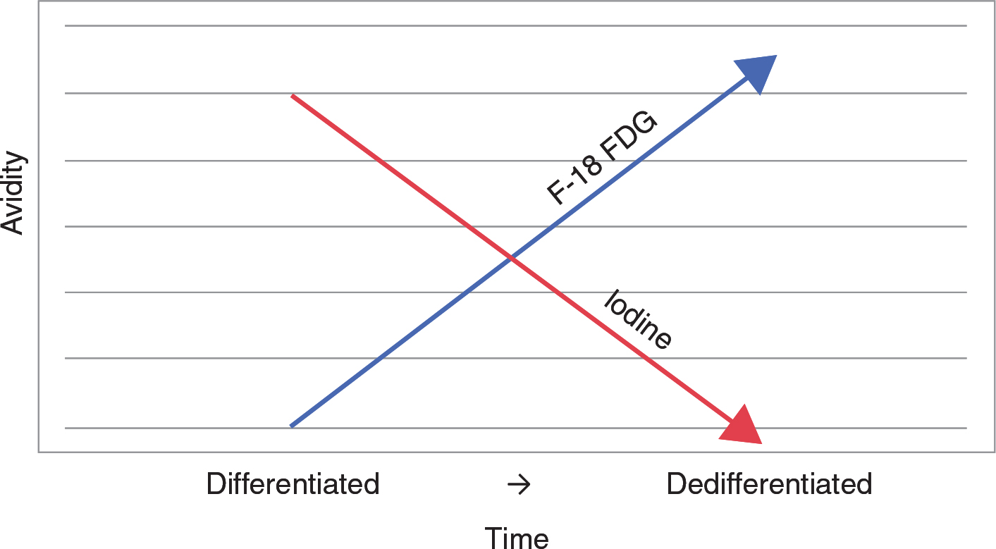 Figure 4. The biological behavior of differentiated thyroid cancers changes over time. Initially, the disease is avid for iodine but can become dedifferentiated or less likely to absorb iodine over time. FDG can be used for imaging in that setting. Some patients may have uptake with both imaging tracers depending on the biological behavior of the individual disease.