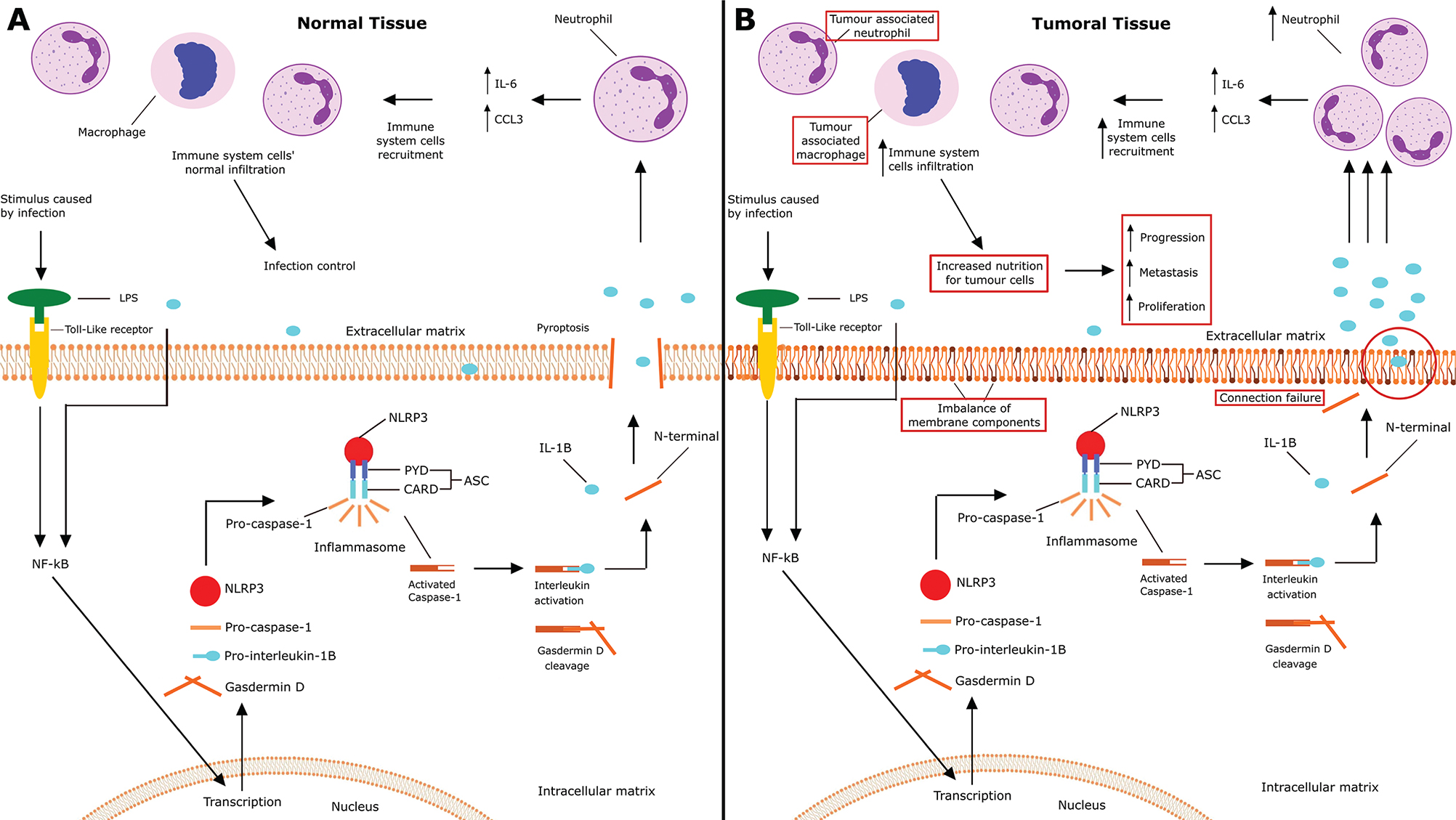 Figure 1 Comparison of NLRP3 inflammasome activation in normal tissue and tumor tissue. A, Demonstration of the pathway in a normal cell. Stimuli caused by infection and IL-1β induce the expression of NLRP3 inflammasome components, gasdermin D, pro-IL-1β, and pro-caspase 1. The NLRP3 inflammasome oligomerization enables the activation of the caspase 1 enzyme responsible for cleaving the pro-IL-1β. The cell secret IL-1β, inducing immune system cell recruitment and infiltration, such as neutrophils that secrete IL-6 and C-C Motif Chemokine Ligand 3 (CCL3). Caspase 1 cleaves gasdermin D and the N-terminal portion is responsible for the formation of pores in the membrane and induction of pyroptosis. This may not occur in the tumor cell because of alterations in tumor cell membrane that make it difficult for the N-terminal connection to membrane lipids. B, Inflammasome activation in a tumor cell causes imbalance of components in the membrane and therefore pyroptosis induction fails. In this case, the recruitment and infiltration of immune system cells occur on a larger scale, increasing nutrition for tumor cells and favoring tumor progression, proliferation, and metastasis.