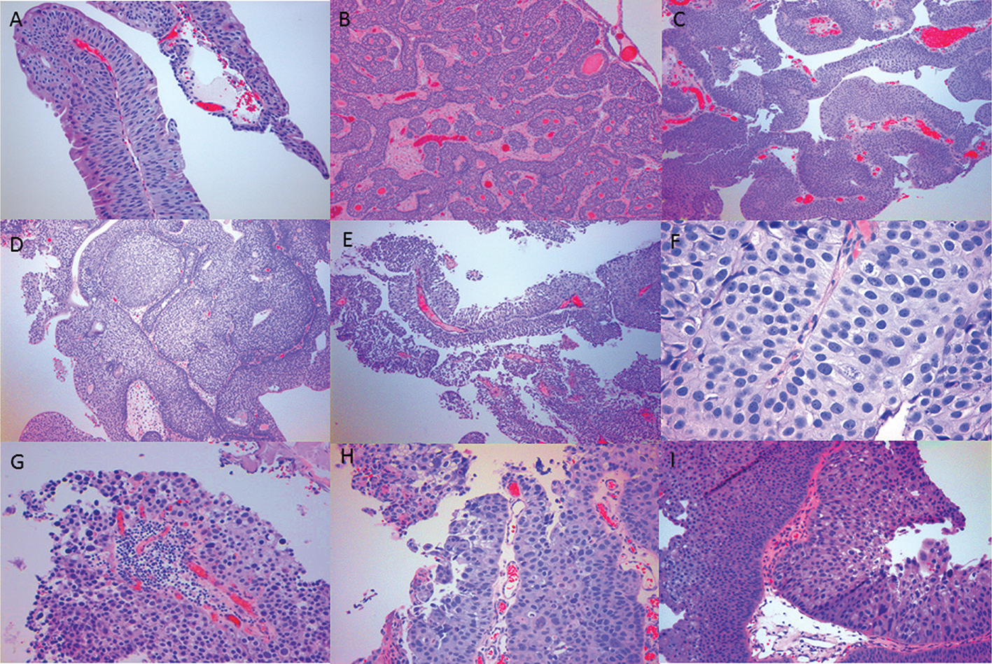 Figure 1. Papillary Urothelial Neoplasms. A, Urothelial papilloma with normal thickness urothelium, no architectural disorder and bland cytology. B, Inverted urothelial papilloma with an endophytic growth pattern with urothelium organized in trabeculae and anastomosing cords. C, Papillary urothelial neoplasm of low malignant potential (PUNLMP) has thickened urothelium, orderly architecture and uniform cytology. D, An inverted form of PUNLMP. E, Low grade non-invasive papillary urothelial carcinoma with long, slender papillae, higher magnification (F) shows mild loss of polarity, mild cytologic pleomorphism and mitoses in the lower half of the urothelium. G and H, High grade non-invasive papillary urothelial carcinoma with complex papillae with and fused architecture. Architectural disorder and nuclear pleomorphism are visible on low power. I, Concurrent low grade and high-grade lesions can be found.