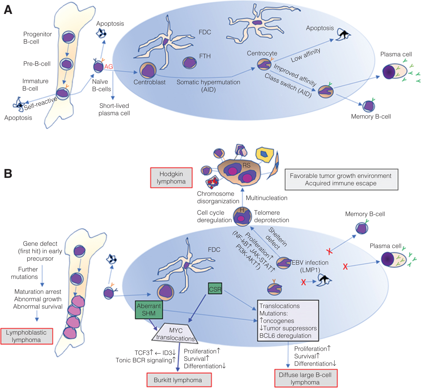 Figure 1. Normal B-cell development and simplified pathogenesis of B-cell lymphomas. A, B-cells develop and mature in the bone marrow where B-cell receptor (BCR) gene is rearranged and BCR is counter-selected for autoreactivity (eliminated by apoptosis if self-reactive). The positively selected B cells become mature naive B cells that leave the bone marrow. Upon encountering cognate antigen, some activated B cells differentiate into short-lived plasma cells secreting low-affinity antibodies and providing a rapid initial response to the antigen. Some activated B cells migrate into lymphoid follicles and initiate a germinal center (GC), where GC-B cells go through somatic hypermutation (SHM) and class switch recombination (CSR), both of which are dependent on the activity of activation-induced cytidine deaminase (AID). After several cycles of proliferation, mutation, and positive selection, GC-B cells differentiate into either high-affinity antibody-secreting plasma cells or memory B cells and leave the GC. B, With further mutations, the B-cell precursors with gene defect gain dysregulated signals of growth, survival and differentiation, and eventually develop into B-lymphoblastic lymphoma. The DNA modification processes of GC-B cells make them prone to chromosome translocations and mutations. The GC-B cells with translocation involving MYC gene and deregulated signal pathways of growth and survival eventually develop into Burkitt lymphoma. With additional genetic lesions, GC-B cells with translocations and/or mutations involving other oncogenes and/or tumor suppressor genes develop into diffuse large B-cell lymphoma of GC-B type. GC-B cells with deregulated NF-κB pathway driven by EBV proto-oncogene LMP1 in EBV+ cases or certain mutations in EBV- cases develop into Hodgkin (H) cells. Chromosome disorganization and multinucleation due to cell cycle deregulation and telomere deprotection lead H cells to develop into Reed-Steinberg (RS) cells. The H and RS cells further their survival by attracting a supportive microenvironment through releasing cytokines and growth factors and suppressing local immune response. Eventually Hodgkin lymphoma is developed. ↑- increased signaling or activity; x- inhibited process.