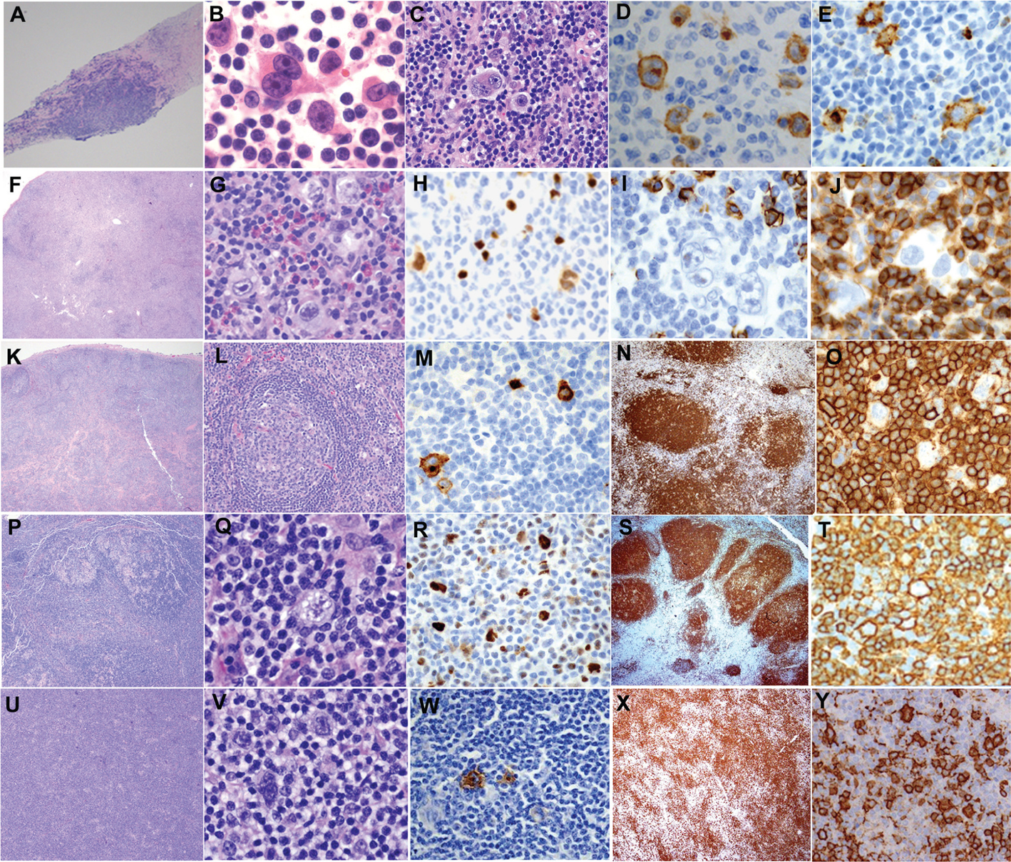 Figure 2. Histologic and immunophenotypic features of Hodgkin lymphoma. A-E, Nodular sclerosis classic Hodgkin lymphoma shows a nodular lesion with collagenous band (A, H&E stain), large mononuclear Hodgkin cells and bi- or multinucleated Reed-Steinberger cells with prominent large nucleoli admixed with mixed background inflammatory cells (B, H&E-stained touch imprint; C, H&E-stained section). The Hodgkin/ Reed-Steinberger (HRS) cells are positive for CD30 with membrane and Golgi pattern (D) and CD15 (E). F-J, Mixed cellularity classic Hodgkin lymphoma shows a diffuse pattern (F, H&E stain) and HRS cells in the background composed of a mixture of inflammatory cells (G, H&E stain). The HRS cells are positive for PAX5 (H), and negative for CD20 (I) and CD45 (J). K-O, Lymphocytes-rich classic Hodgkin lymphoma shows a nodular pattern and scattered HRS cells located in the nodules, but outside the germinal center (K and L, H&E stain). The HRS cells are positive for CD30 (M) and negative for CD20 (N and O). P-T, Classical nodular lymphocyte predominant Hodgkin lymphoma (NLPHL) shows distorted B-cell rich nodules (P, H&E stain; S, CD20 IHC stain) and popcorn-shaped LP cells in the nodule (Q, H&E stain). The LP cells are positive for BCL6 (R) and CD20 (T). U-Y, Variant NLPHL shows diffuse B-cell rich pattern (U, H&E stain; X, CD20 IHC stain) and scattered LP cells with surrounding small lymphocytes (V, H&E stain). The LP cells are positive for EMA (W) and CD20 (Y).