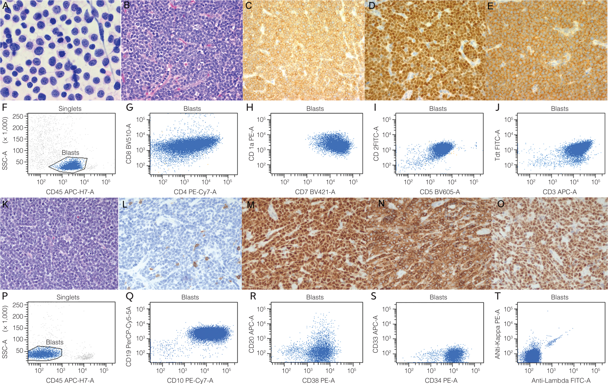 Figure 3. Histologic and immunophenotypic features of lymphoblastic lymphoma. A-J, T-cell lymphoblastic lymphoma shows sheets of monotonous medium-sized blasts with round, oval or irregular nuclei, granular nuclear chromatin, frequent mitotic and apoptotic figures (A, H&E-stained touch imprint; B, H&E-stained section), positivity for CD3 (C), TdT (D) and CD99 (E) by IHC; and positivity for CD45 , CD4, CD8, CD1a, CD7 , CD2, CD5, TdT and cytoplasmic CD3 by flow cytometry (FCM) (F-J). K-T, B-cell lymphoblastic lymphoma shows similar cytomorphology (K, H&E stain), positivity for TdT (M), CD10 (N) and PAX5 (O), and negativity for CD3 (L) by IHC; positivity for CD19, CD10, CD38 and CD34, and negativity for CD45, CD20, CD33, kappa and lambda by FCM (P-T).