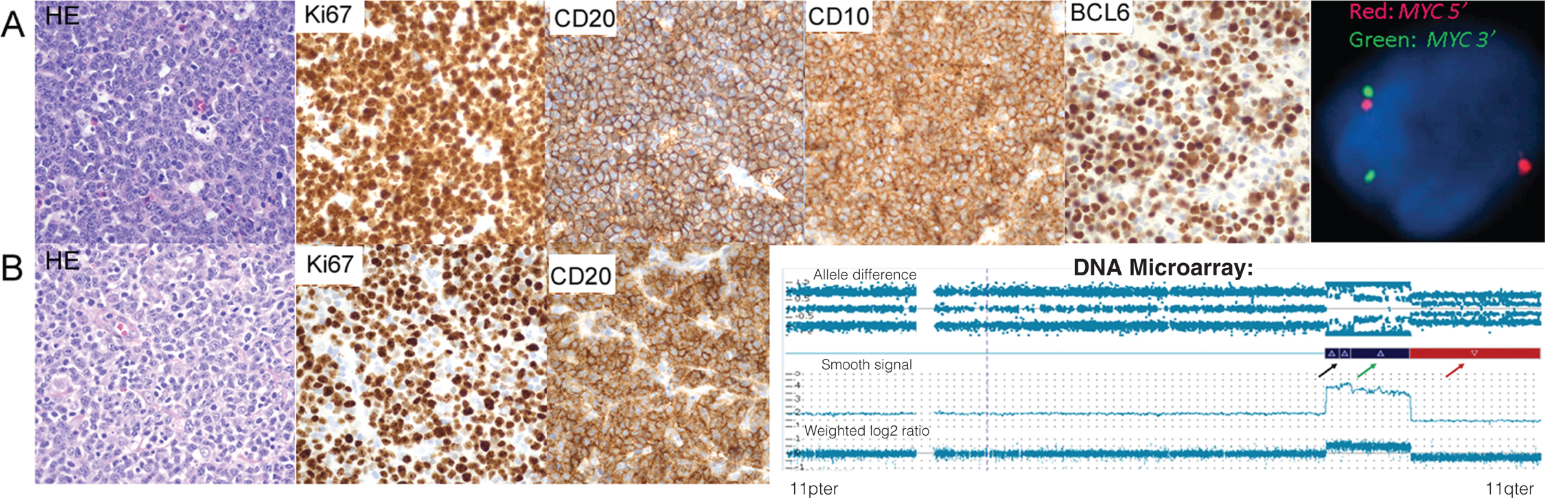 Figure 4. Pathology of Burkitt lymphoma (BL) and Burkitt-like lymphoma with 11q aberration (BLL-11q). A, Classical BL shows sheets of monomorphic medium-sized tumor cells with round nuclei, finely dispersed chromatin, and multiple basophilic small to intermediate-sized nucleoli, frequent mitoses and apoptotic bodies, and scattered tingible body macrophages resulting in a starry-sky appearance, and 100% Ki-67 positivity. Tumor cells are positive for CD20, CD10, BCL6. Fluorescence in situ hybridization (FISH) analysis using MYC break-apart probe shows MYC rearrangement. B, BLL-11q shows sheets of medium-sized tumor cells with mild nuclear pleomorphism, expression of CD20, high Ki-67 proliferation index (close to 100%) and lack of starry-sky appearance. Microarray analysis shows segmental gains within 11q with adjacent terminal loss. Solid blue bar represents area of gain (green arrow) and amplification (black arrow), and solid red bar indicates area of loss (red arrow) within chromosome 11.