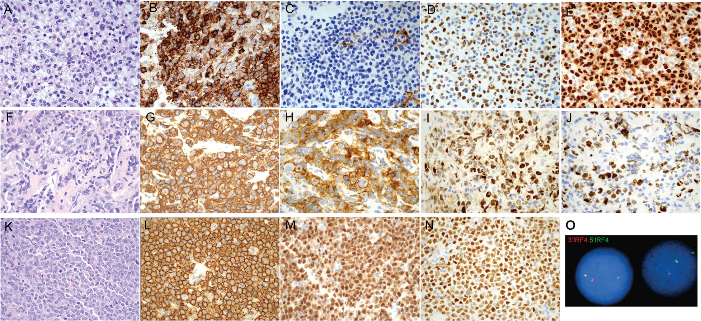 Figure 5. Histologic and immunophenotypic features of diffuse large B-cell lymphoma. A-E, Diffuse large B-cell lymphoma, NOS, non-germinal center B-cell type, shows sheets of large mostly immunoblast-type tumor cells (A) positive for CD20 (B), BCL6 (D) and MUM1 (E) and negative for CD10 (C). F-J, Primary mediastinal large B-cell lymphoma shows pleomorphic medium to large sized tumor cells in a sclerotic background (F). The tumor cells are positive for CD20 (G), CD30 (H), BCL6 (I) and high Ki67 positivity (J). K-O, Large B-cell lymphoma with IRF4 rearrangement shows sheets of monomorphic medium-sized tumor cells with fine chromatin, multiple basophilic small nucleoli and frequent mitosis (K), diffuse positivity for CD20 (L), MUM1 (M), BCL6 (N), and IRF4 gene rearrangement (O).