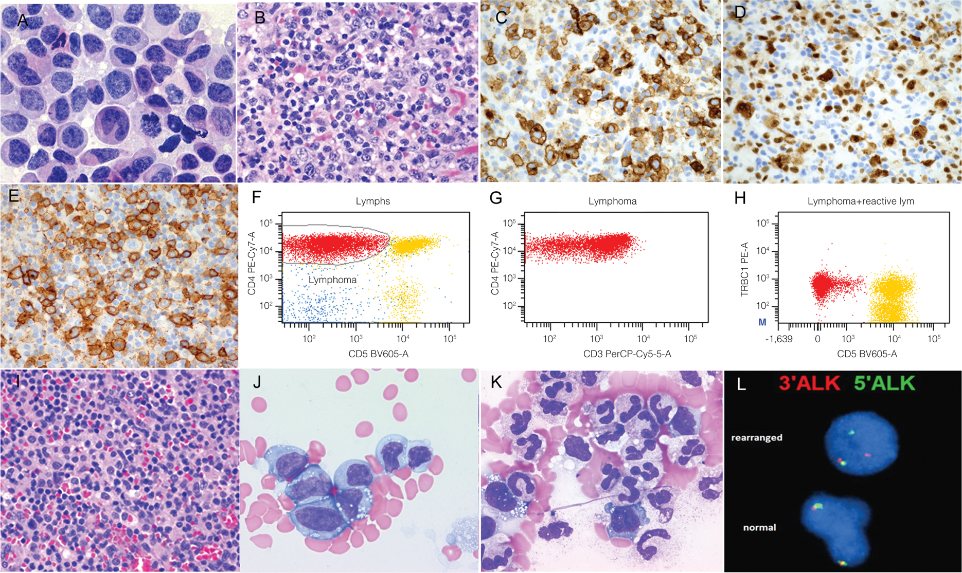 Figure 6. Histologic and immunophenotypic features of anaplastic large cell lymphoma (ALCL). A, H&E-stained touch imprint slide of the common type reveals many large pleomorphic tumor cells with round or irregular nuclei, dispersed nuclear chromatin and moderately abundant eosinophilic cytoplasm. Hallmark cells and mitoses are present. B, H&E-stained section reveals many large pleomorphic tumor cells and some scattered small lymphocytes. C, Tumor cells are positive for CD30, which is stronger in large cells. D, ALK1 is expressed in the variably sized tumor cells with a nuclear and cytoplasmic pattern. E, Tumor cells are positive for EMA. F-H, Flow cytometry study reveals an abnormal cell population (red) positive for CD4, CD3 (partial) and negative for CD5. The abnormal cell population is monotypic (TRBC1+ only) indicating a monoclonal proliferation. The reactive T cells (yellow) are polytypic (mixed TRBC1+ and TRBC1- cells) indicating the polyclonal nature. I, Lymphohistiocytic variant of ALCL shows frequent histiocytes. J, Many tumor cells are present in the peripheral blood, mimicking acute monocytic leukemia morphologically. K, ALCL causes leukemoid reaction mimicking juvenile myelomonocytic leukemia morphologically. L, Fluorescence in situ hybridization (FISH) analysis using ALK break-apart probe reveals ALK gene rearrangement.
