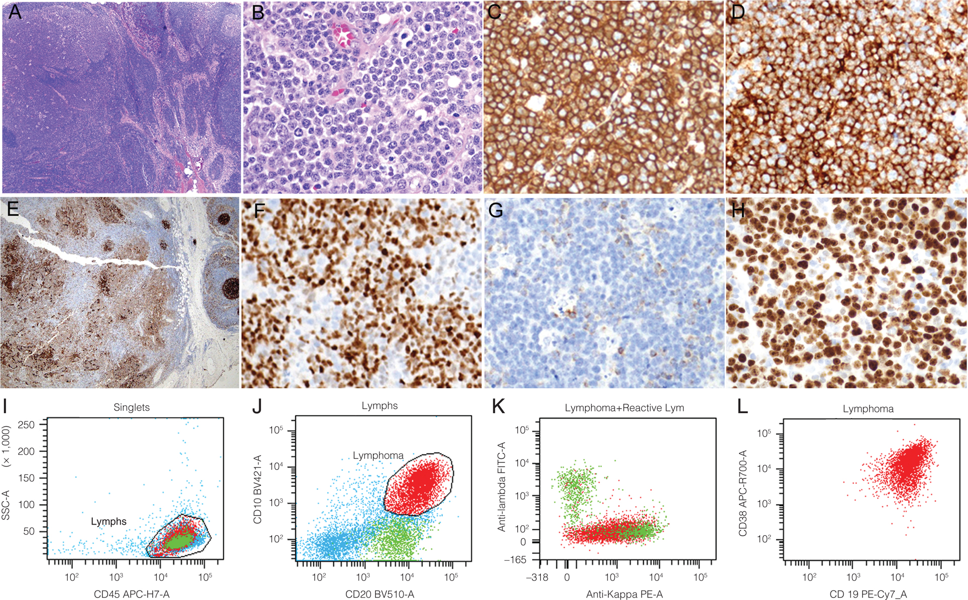 Figure 7. Histologic and immunophenotypic features of pediatric type follicular lymphoma (PTFL). A, The nodal architecture is partially effaced by ill-defined, coalescent follicles with starry-sky pattern. Residual normal nodal tissue with germinal centers is on the right side. B, High power view shows sheets of medium-sized blastoid cells within the abnormal follicles. There are frequent mitoses and apoptotic bodies. C-H, IHC stains reveal that the tumor cells are diffusely positive for CD20 (C), CD10 (D), BCL6 (F) and mostly negative for BCL2 (G). CD21 (E) highlights the distorted follicular dendritic meshwork (FDMW) in the abnormal follicles (left) and intact FDMW in normal follicles (right). Ki67 staining reveals high (>90%) proliferation index. I-L, Flow cytometry study reveals a kappa-restricted B-cell population (red) with expression of CD45, CD10, CD20, CD38 and CD19.