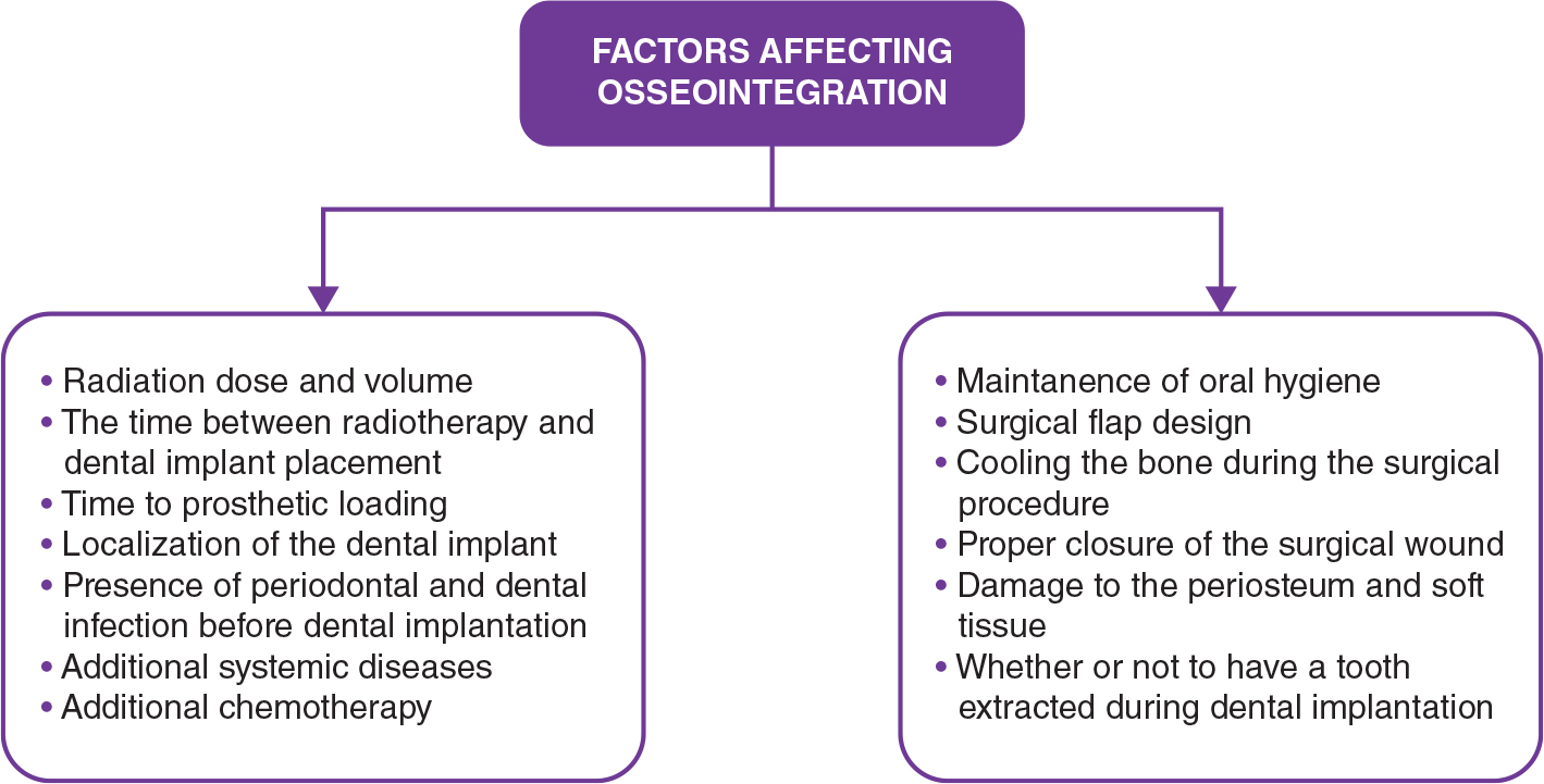 Anchoring of the implant in the bone, known as osseointegration (19–21), is essential for implant stability and is viewed as a requirement for implant loading and long-term clinical success (22, 23). Local and systemic factors can affect osseointegration and cause early or delayed implant failures (24–27). Local factors include implant design, dental implant diameter and length, surface structure, quantity and quality of bone, history of periodontitis, surgical technique, RT, and timing of implant placement. Systemic factors that can affect osseointegration include osteoporosis, collagen vascular disease, and diabetes mellitus (28).