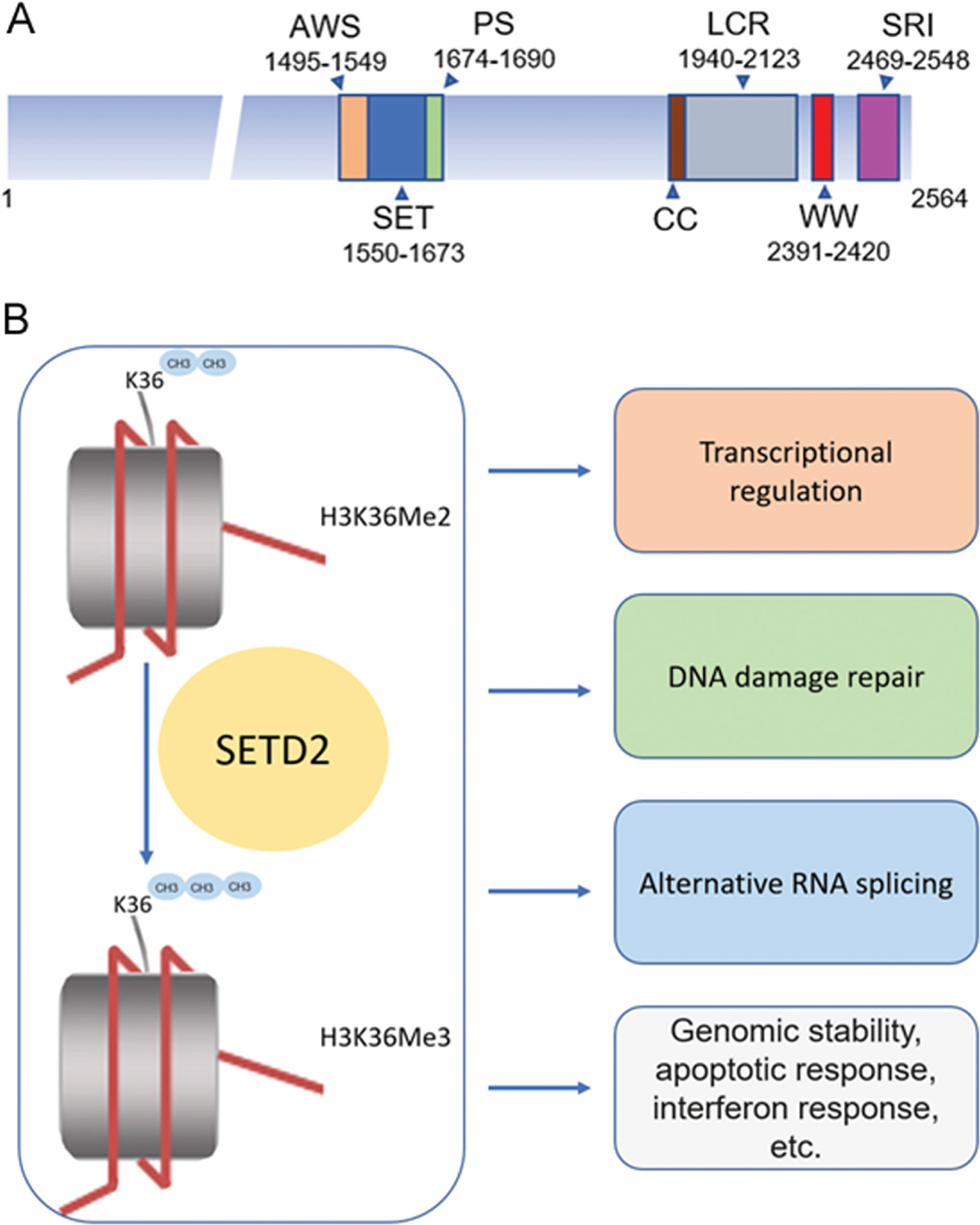 Figure 1. The structure and cellular functions of SETD2 protein. A, SETD2 protein is composed of 2,564 amino acids and contains three main conserved functional domains: AWS-SET-PS, WW and CC domains, and SRI. B, SETD2 protein is a histone methyltransferase that specifically trimethylates ‘Lys-36’ of histone H3 (H3K36me3) using dimethylated ‘Lys-36’ (H3K36me2) as substrate. It has multiple cellular functions that include transcriptional regulation, DNA damage repair, alternative RNA splicing, keeping genomic stability, regulating apoptotic response, involving in interferon response, etc. AWS, associated with SET; CC, Coiled-Coiled; PS, post-SET; SETD2, SET domain-containing 2; SRI, Set2-Rpb1 interacting.
