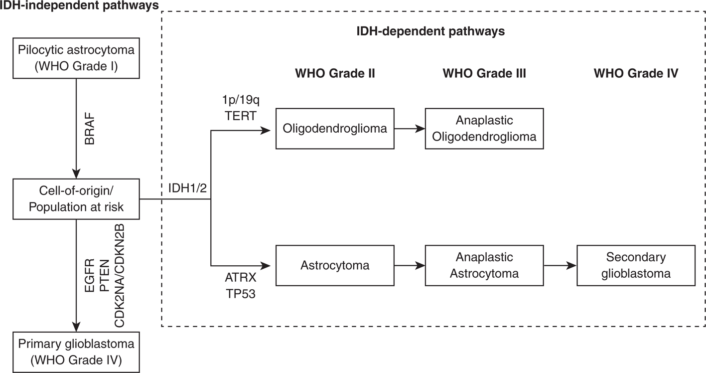Figure 1 Molecular pathways to gliomagenesis. While the cell of origin in glioma is yet to be identified, large-scale expression and copy-number analyses have determined multiple molecular processes that result in glioma formation. Primary glioblastomas (and most Grade I gliomas) arise via an IDH-independent pathway. Conversely, IDH mutation is an early if not initiating event in the development of of low-grade astrocytomas and oligodendrogliomas. By definition, secondary glioblastomas arise from malignant degeneration of an IDH-mutant lower grade tumor.
